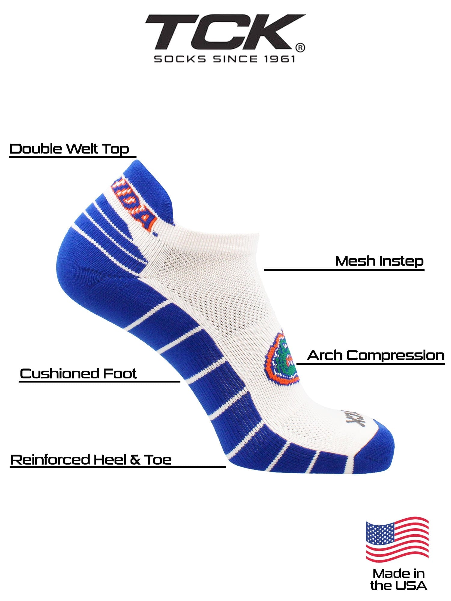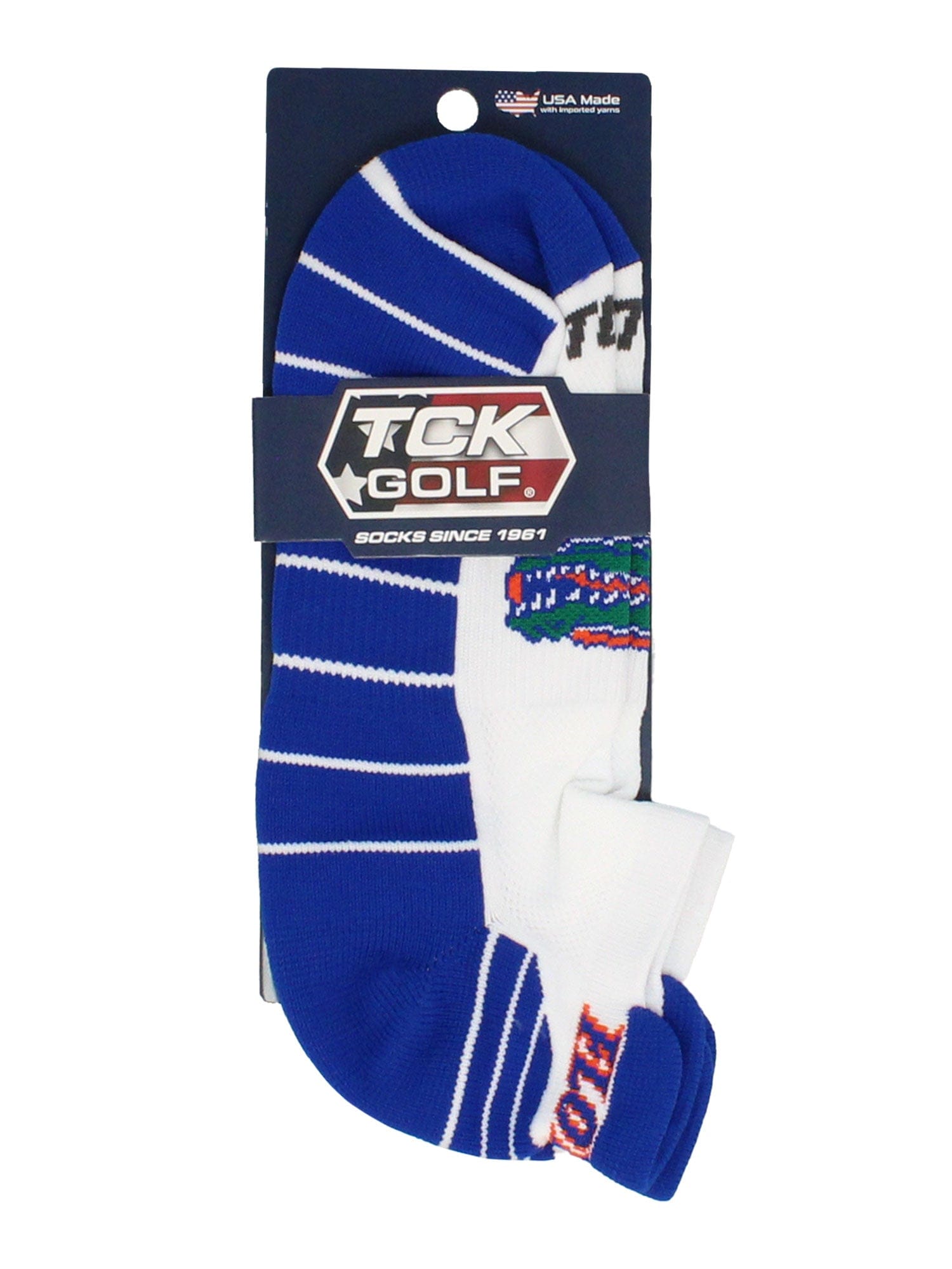 TCK college golf socks, low cut socks with tabbed heel. Heel tab socks ensure the socks don't slip down. Get ready to cheer on your favorite team during the season! Wear these to the tailgate party, on the golf course, working out, or lounge around the house. Offering comfort, breathability, and durability these high quality University of Florida Gators socks are an ideal gift for birthdays, stocking stuffers or going back to school. Gear up for the big game! Go Gators!