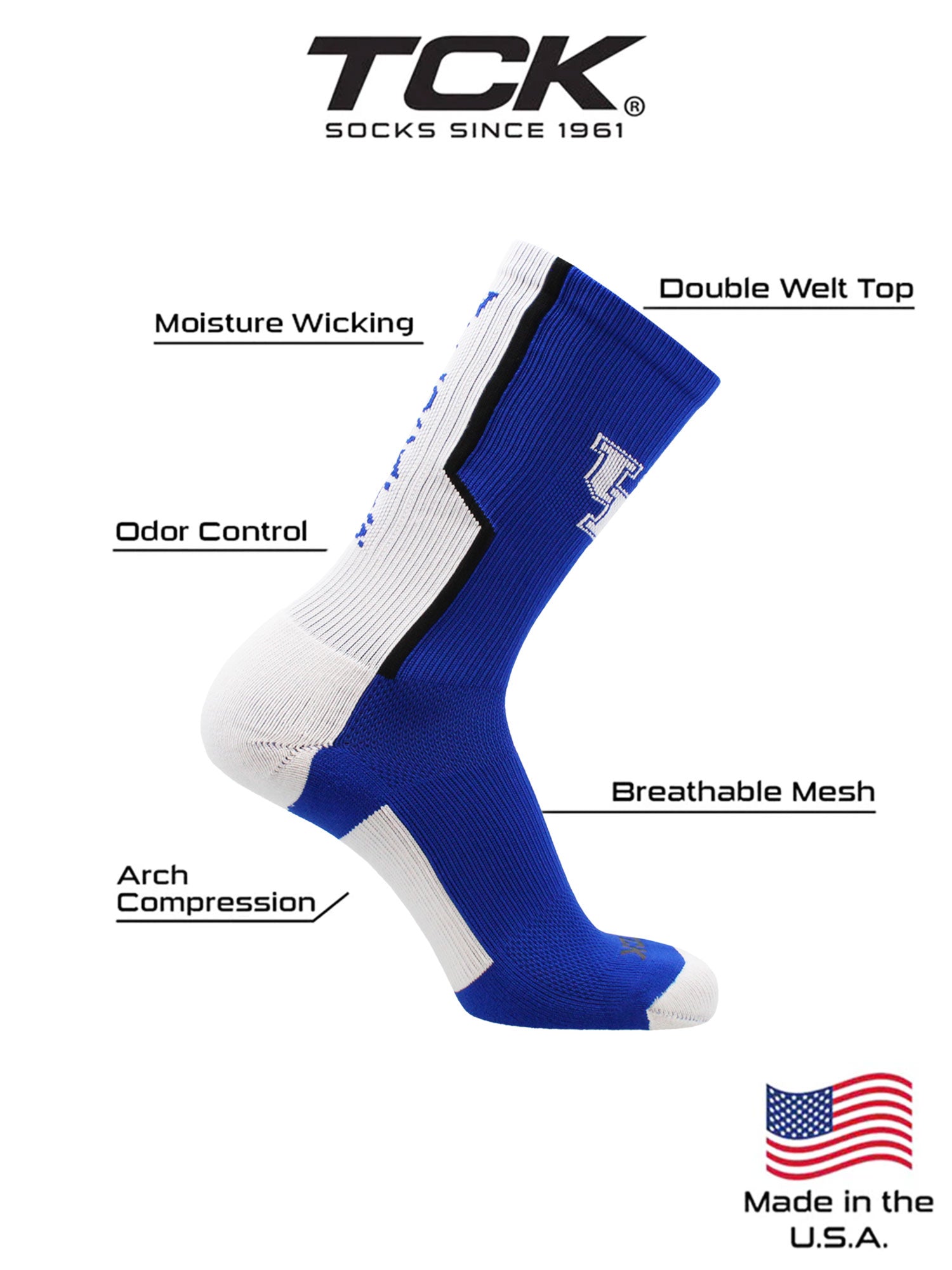 - COMFORT AND BREATHABILITY: These premium quality Kentucky Socks provide soft comfort. Mesh panel ventillation above the foot allows for proper air flow. Keeping the feet dry. Moisture management technology pulls away moisture from skin.