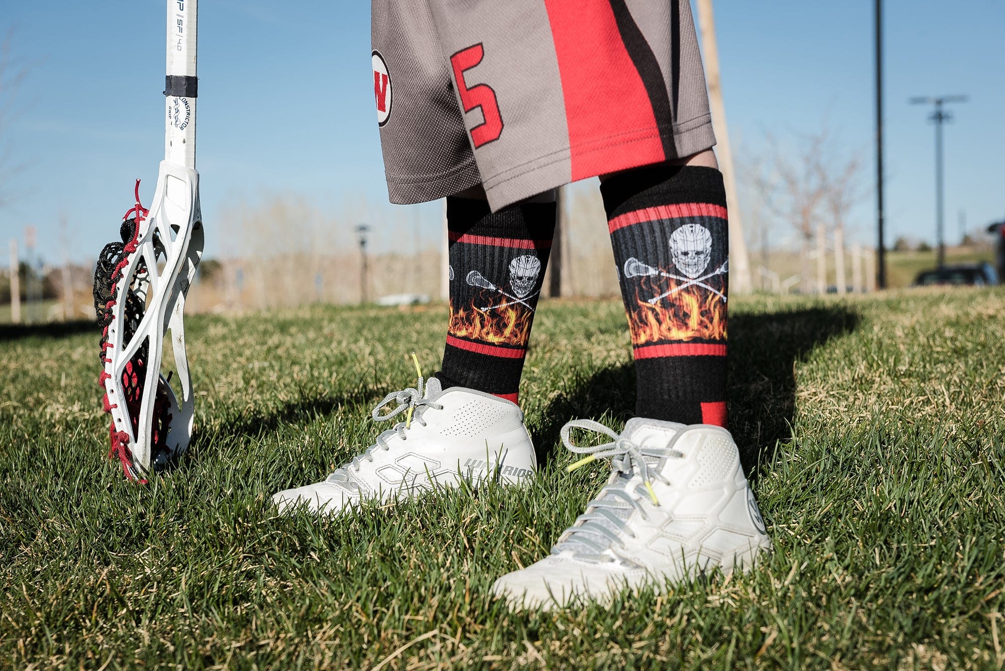 - PERFECT LACROSSE SOCKS: Stand out on the field in these super cool Flaming Skull socks. This sock is crew length (hits mid-calf) and is a sublimated print. Sure to be a hit with your favorite Lacrosse player!