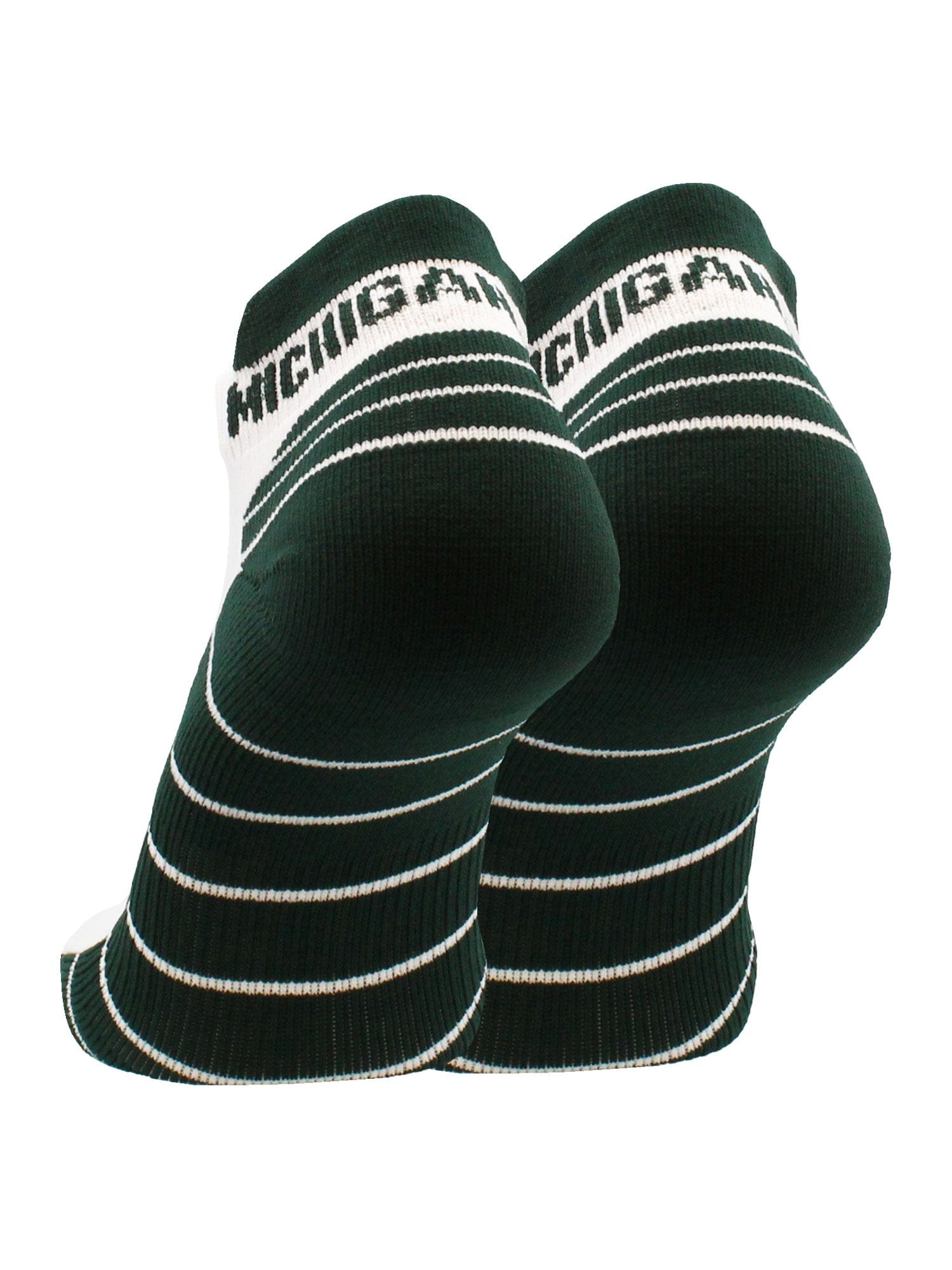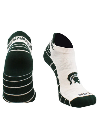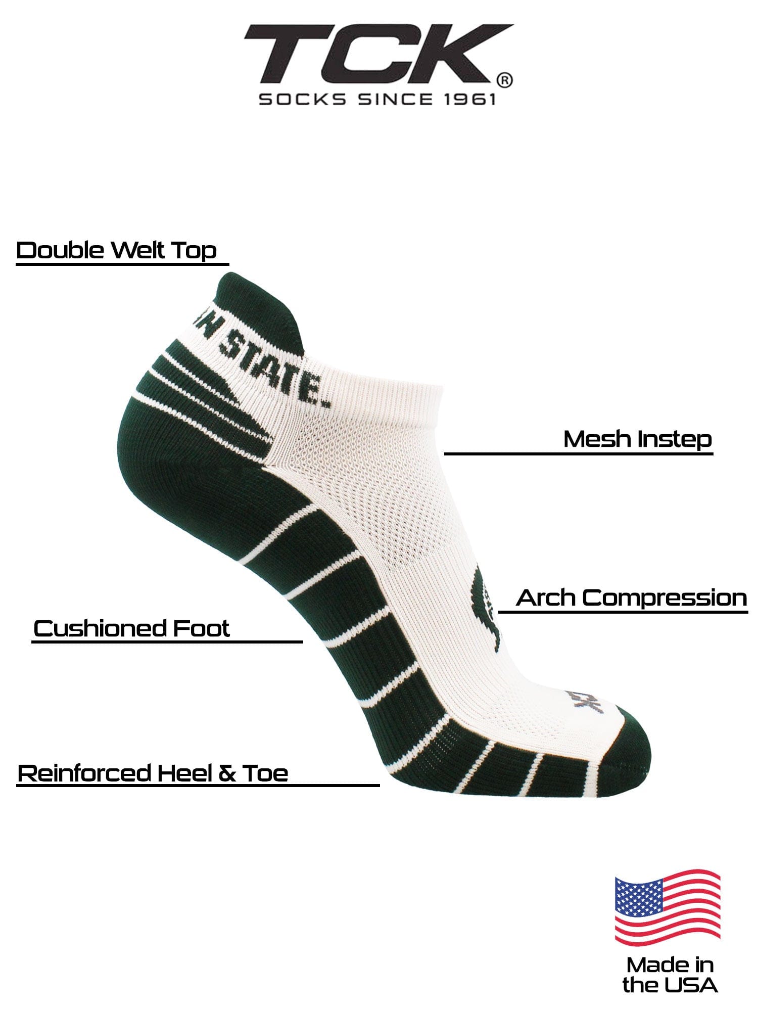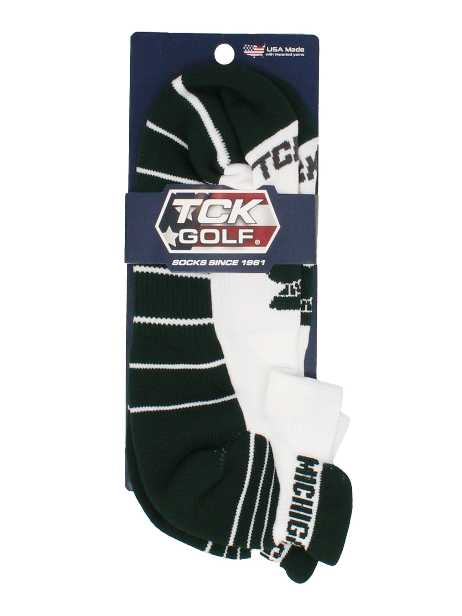 TCK college golf socks, low cut socks with tabbed heel. Heel tab socks ensure the socks don't slip down. Get ready to cheer on your favorite team during the season! Wear these to the tailgate party, on the golf course, working out, or lounge around the house. Offering comfort, breathability, and durability these high quality Michigan State University Spartans socks are an ideal gift for birthdays, stocking stuffers or going back to school. Gear up for the big game! Let's Go Sparty!