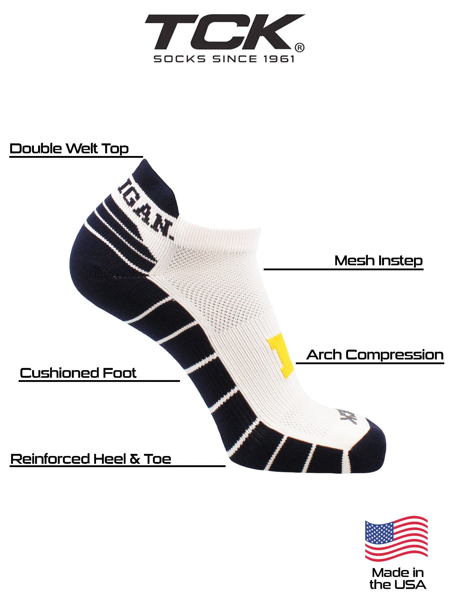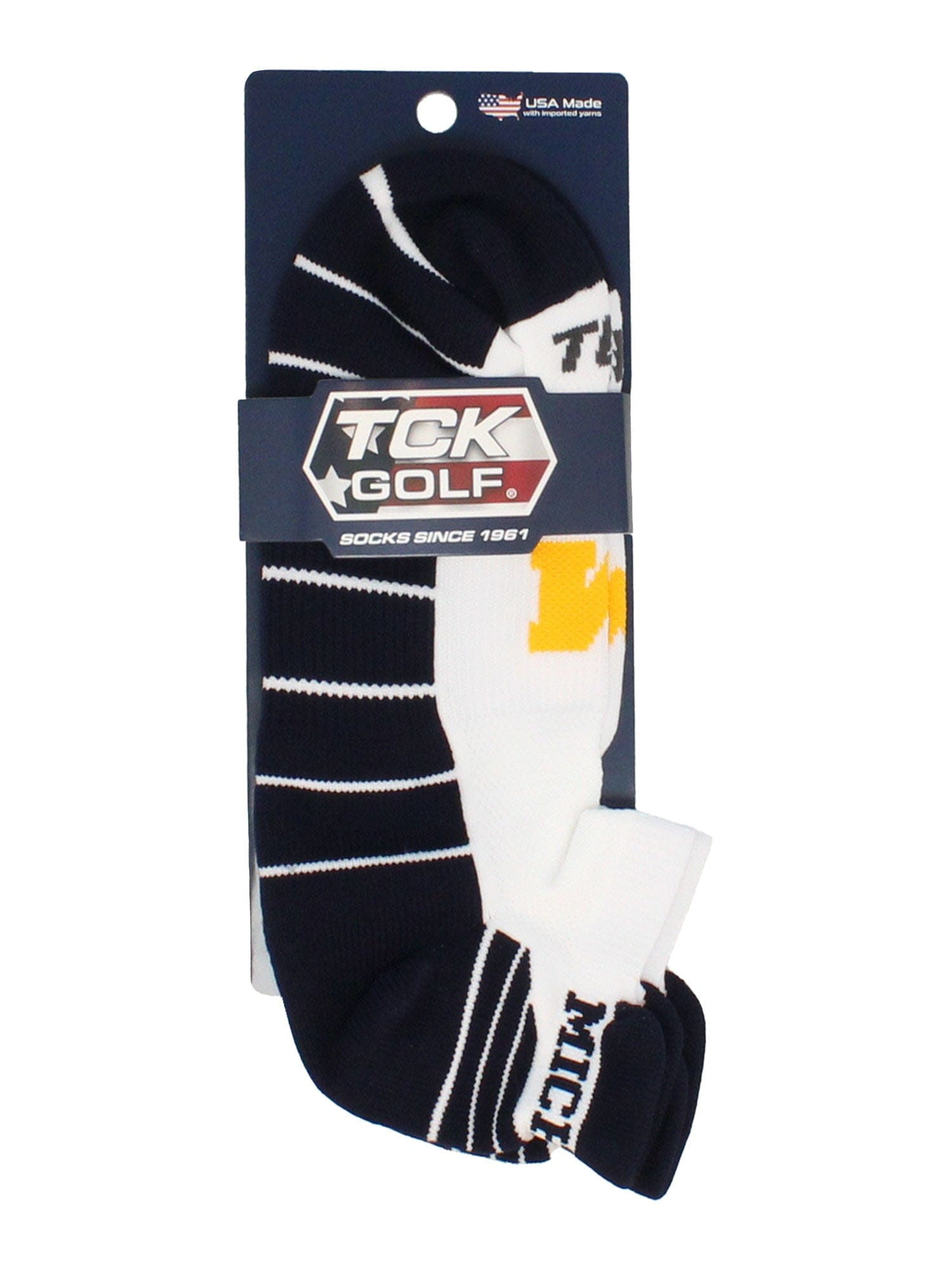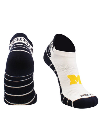TCK college golf socks, low cut socks with tabbed heel. Heel tab socks ensure the socks don't slip down. Get ready to cheer on your favorite team during the season! Wear these to the tailgate party, on the golf course, working out, or lounge around the house. Offering comfort, breathability, and durability these high quality University of Michigan Wolverines socks are an ideal gift for birthdays, stocking stuffers or going back to school. Gear up for the big game! Maize & Blue!