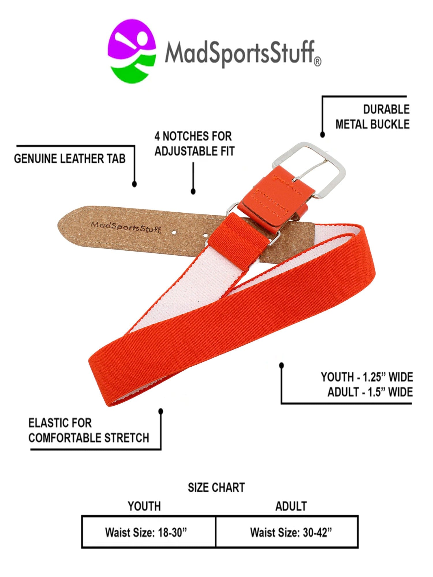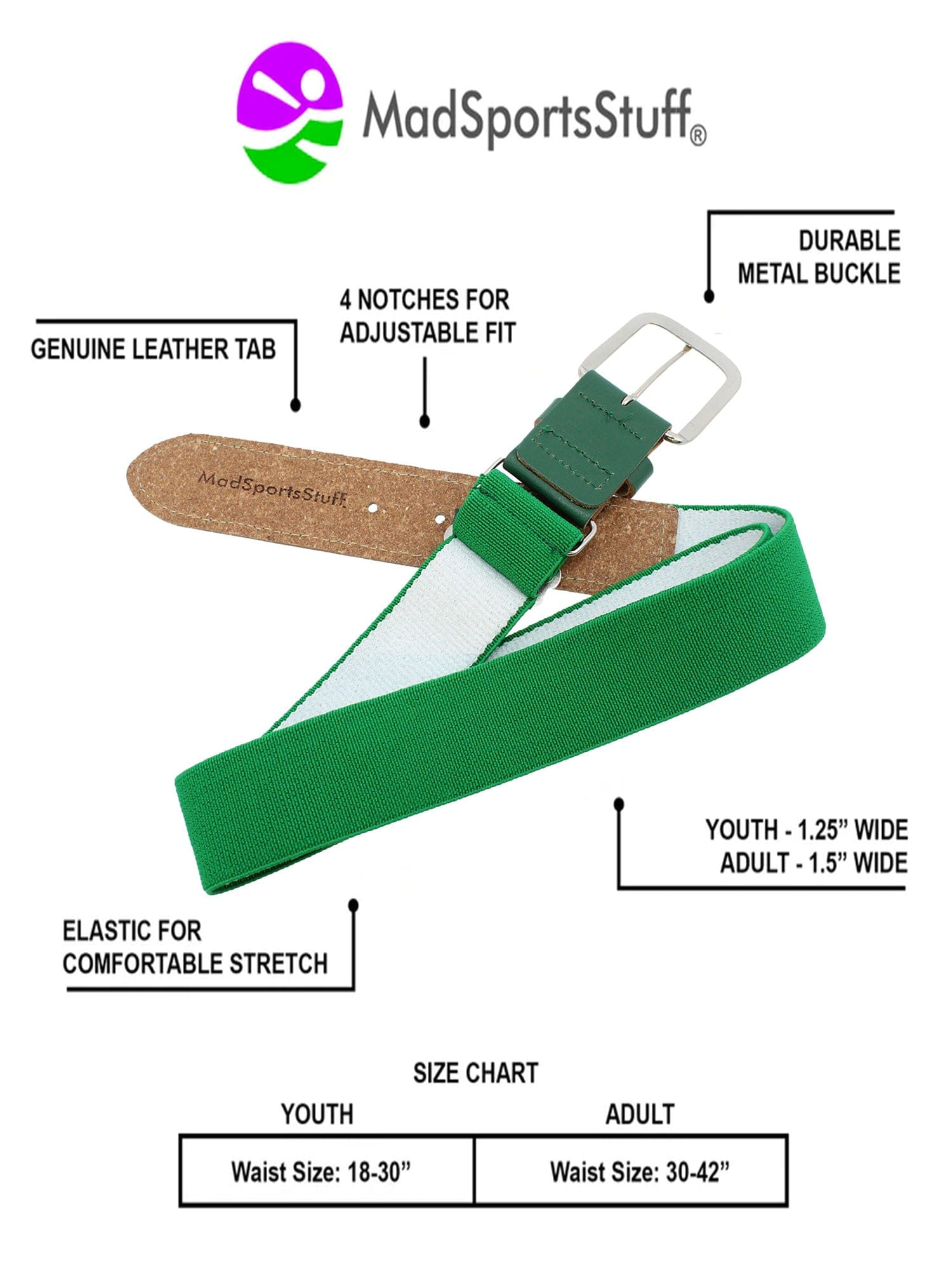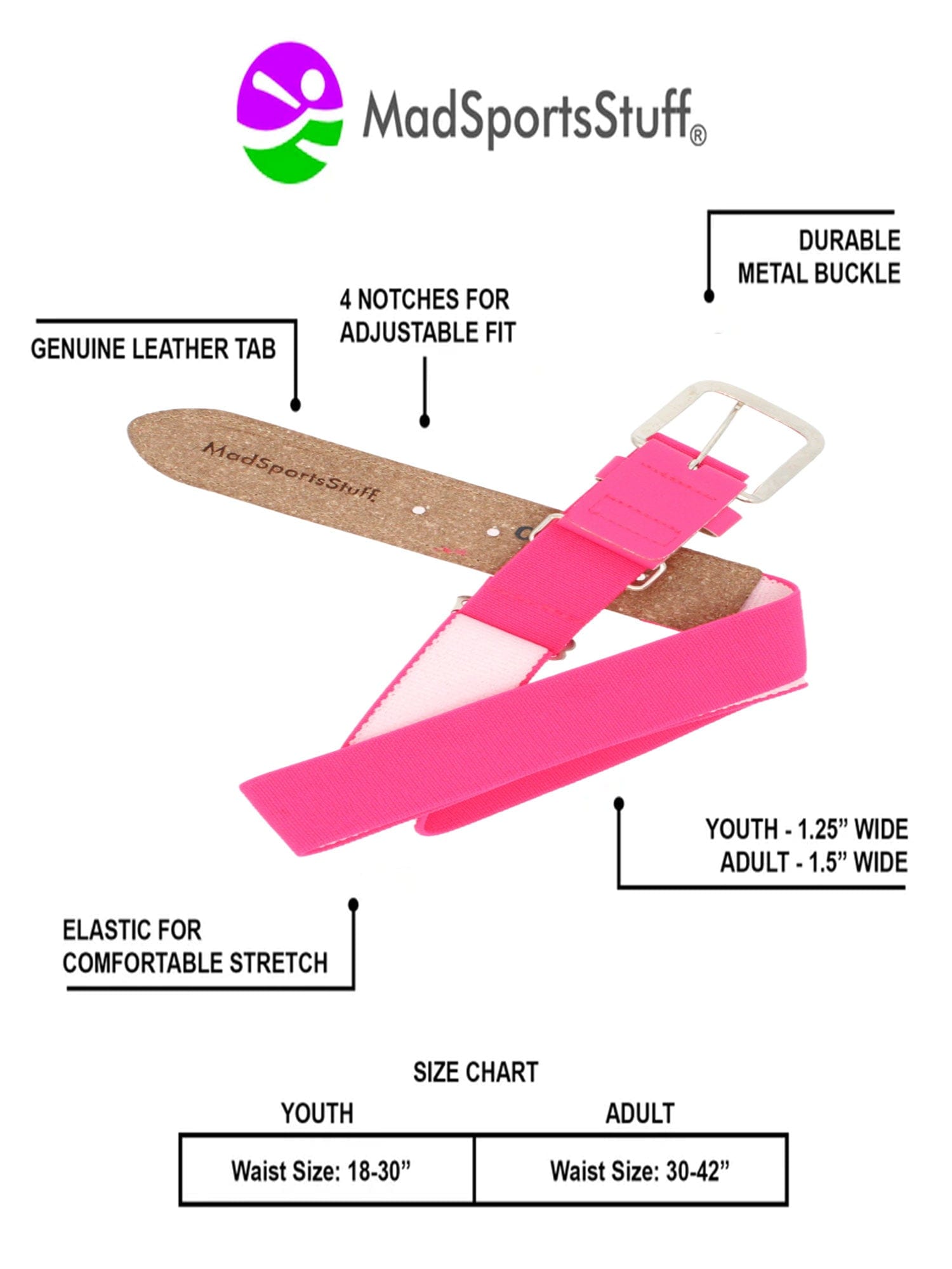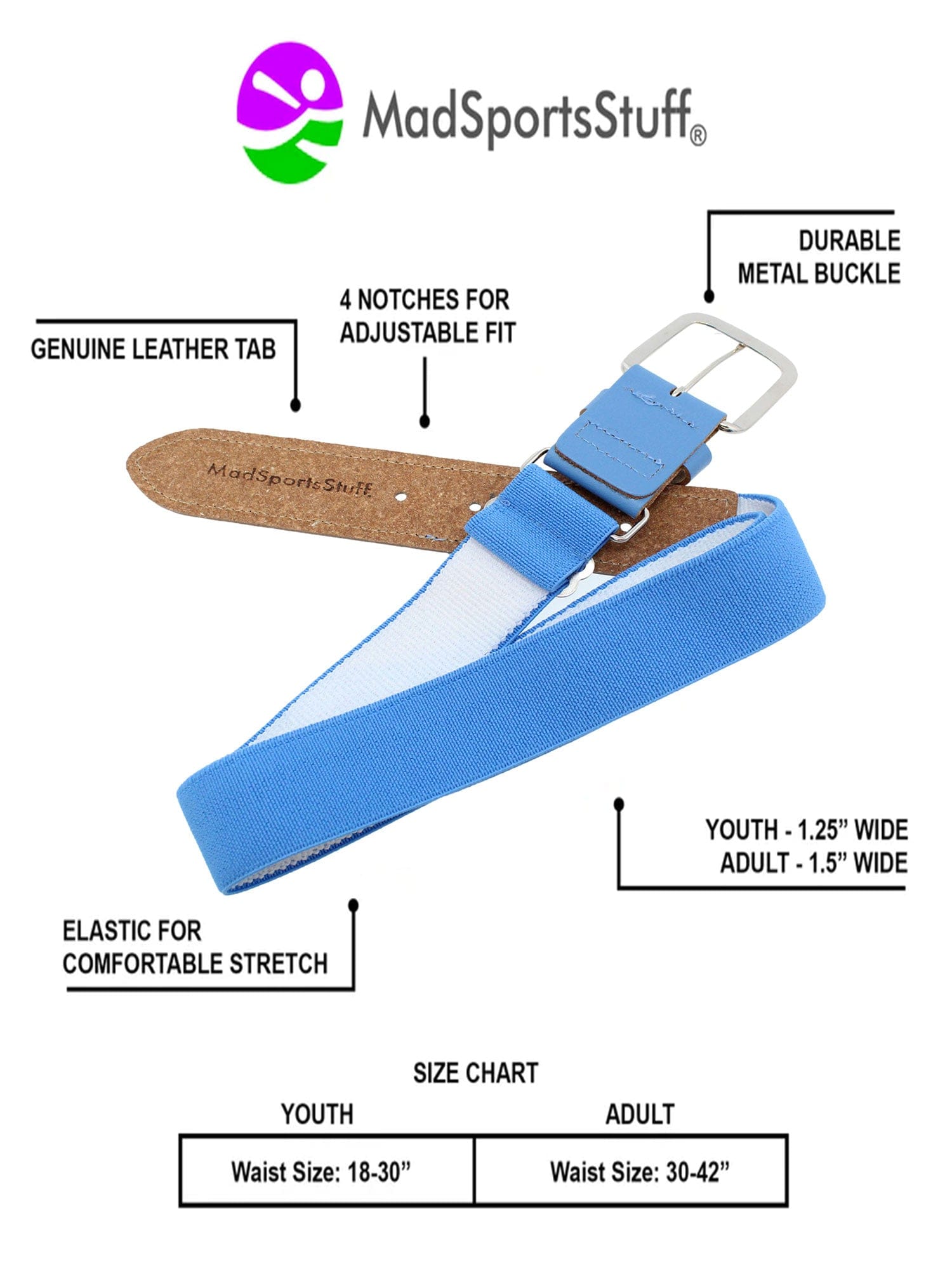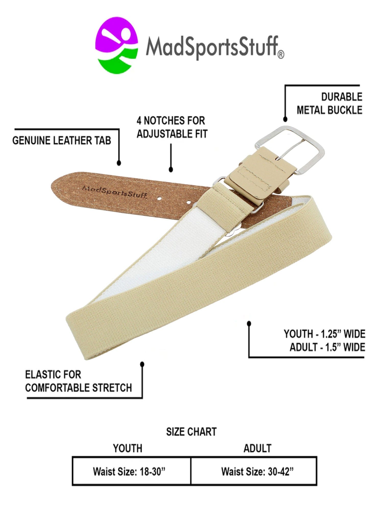 These high performance, moisture wicking, multi-sport over the calf socks are an ideal weight and length for softball, baseball, and football. MadSportsStuff softball belts are made for performance by combining elastic webbing with poyurethane and genuine leather. Our belts have a slide adjuster and belt holes, making it very easy to adjust. Small socks come with Youth size Belt and all others come an Adult size Belt.