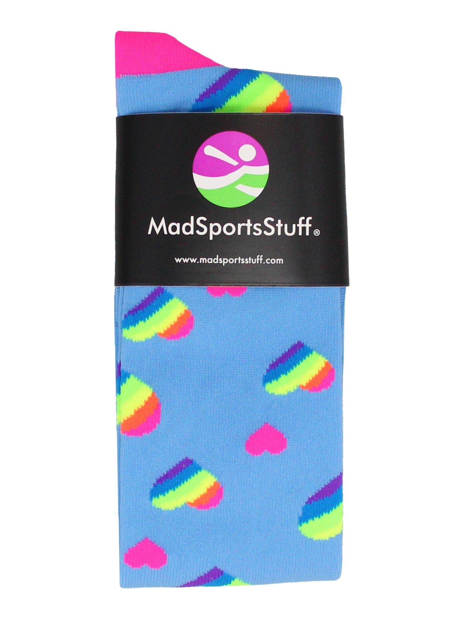 MadSportsStuff Rainbow Hearts Soccer Socks. High performance long sports socks for soccer or softball. Available in girls and womens sizes. Perfect for team socks or team gifts.