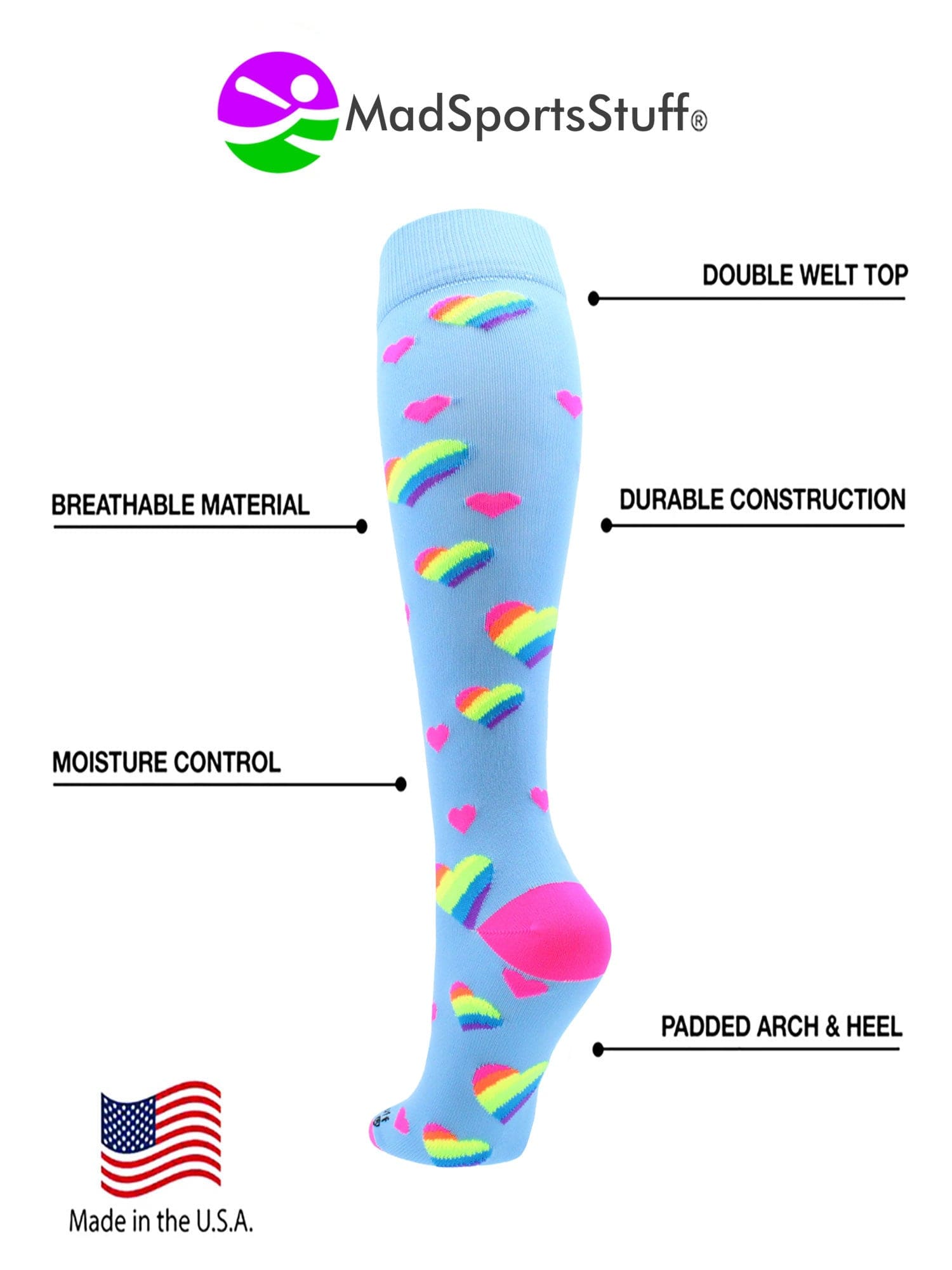 - MADE IN THE USA: These Rainbow Heart Soccer Socks are made with love in the USA