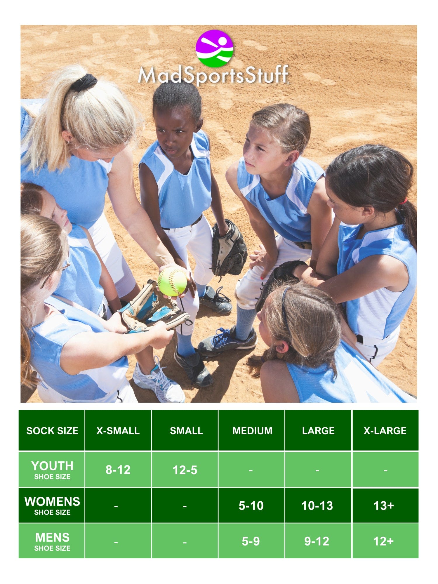• ACCURATE SIZING: MadSportsStuff Sock Size: X-Small - Youth Shoe Size 8-12, Small - Youth Shoe Size 12-5, Medium - Womens Shoe Size 5-10 Mens Shoe Size 5-9, Large - Womens Shoe Size 10-13 Mens Shoe Size 9-12, X-Large Womens Shoe Size 13+ Mens Shoe Size 12+