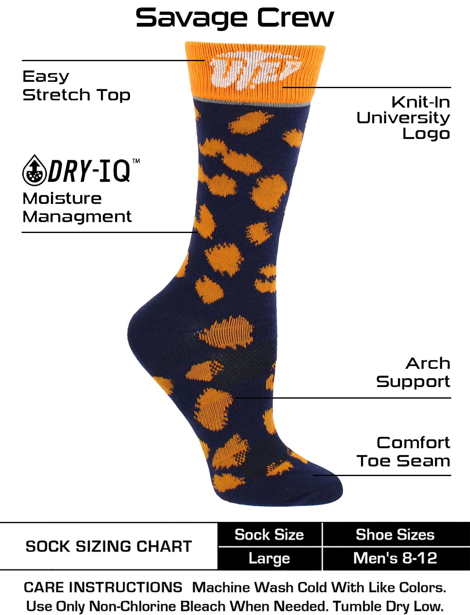 Show your school spirit in the office, at a wedding, at the football stadium or basketball game. Soft and durable, these socks let you maintain a professional look while you support your school. Offering comfort, breathability, performance, and durability these high quality University of Texas El Paso Miners socks are an ideal gift for birthdays, stocking stuffers, Mother's Day or going back to school. TCK Womens Savage Socks are made up of 97% Polyester, 3% Spandex. Go Miners!