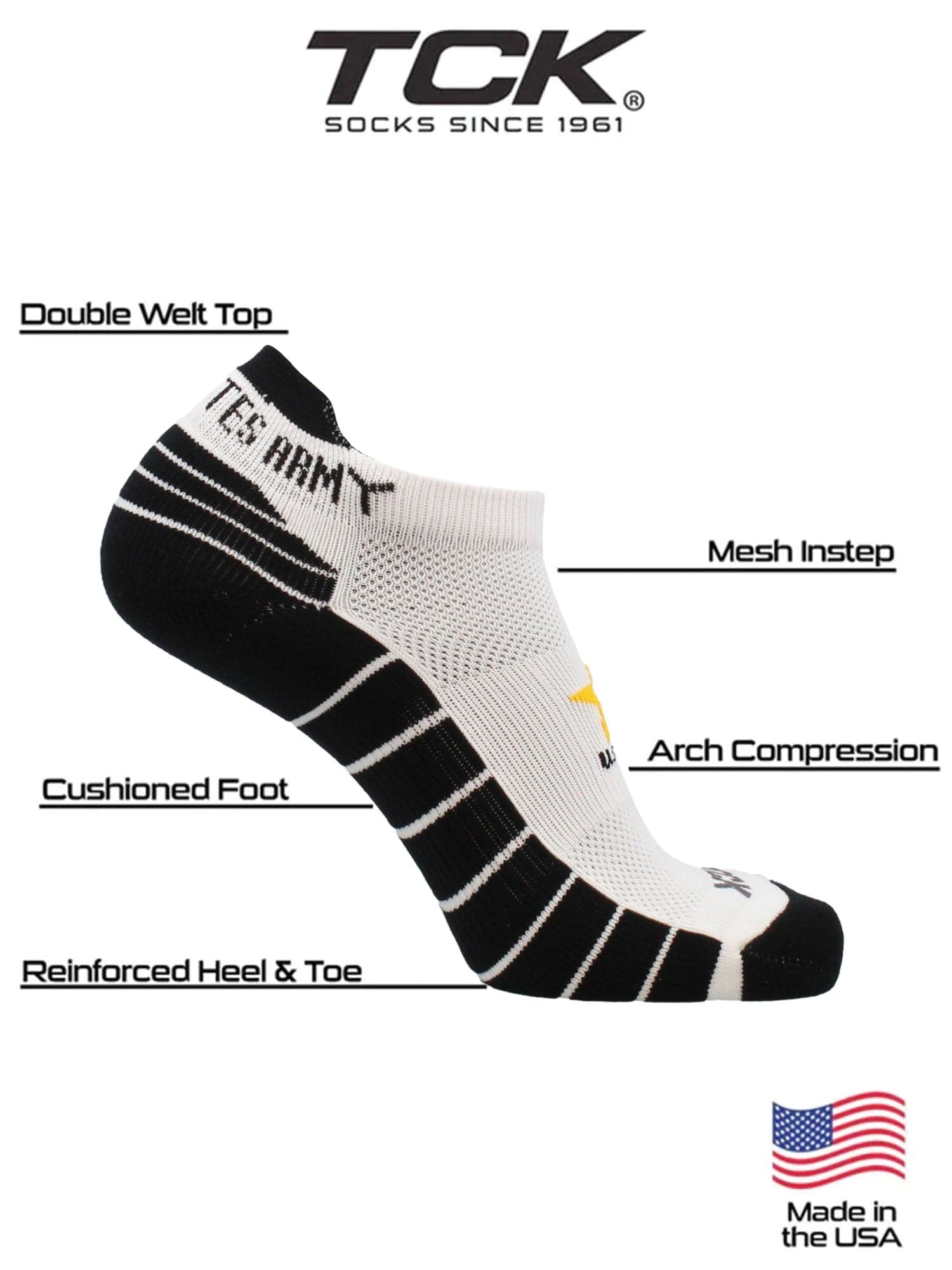 TCK military and armed forces low cut socks with tabbed heel. Show your support the US Army, Navy, Marines, and Air Force. Heel tab socks ensure the socks don't slip down. Wear these to gym for working out, or lounge around the house. Offering comfort, breathability, and durability these high quality military socks are an ideal gift for birthdays, stocking stuffers or just to show your support for a loved one currently serving or for military veterans. Support the troops!