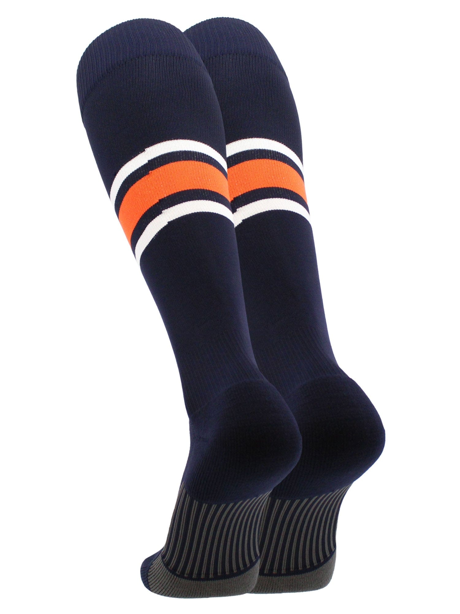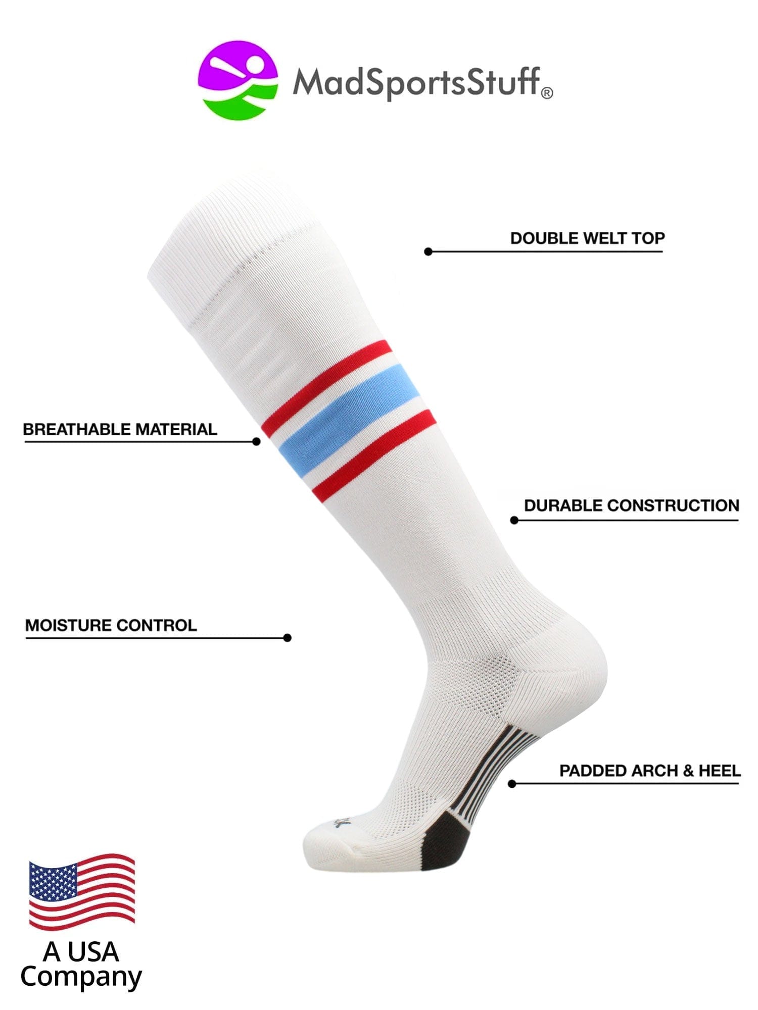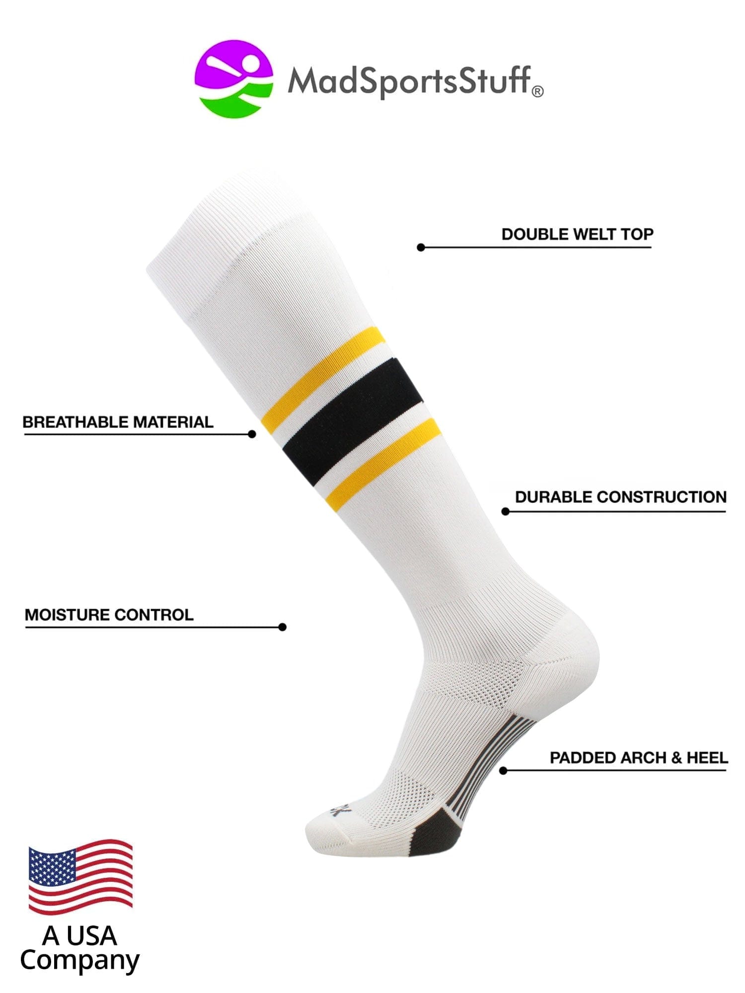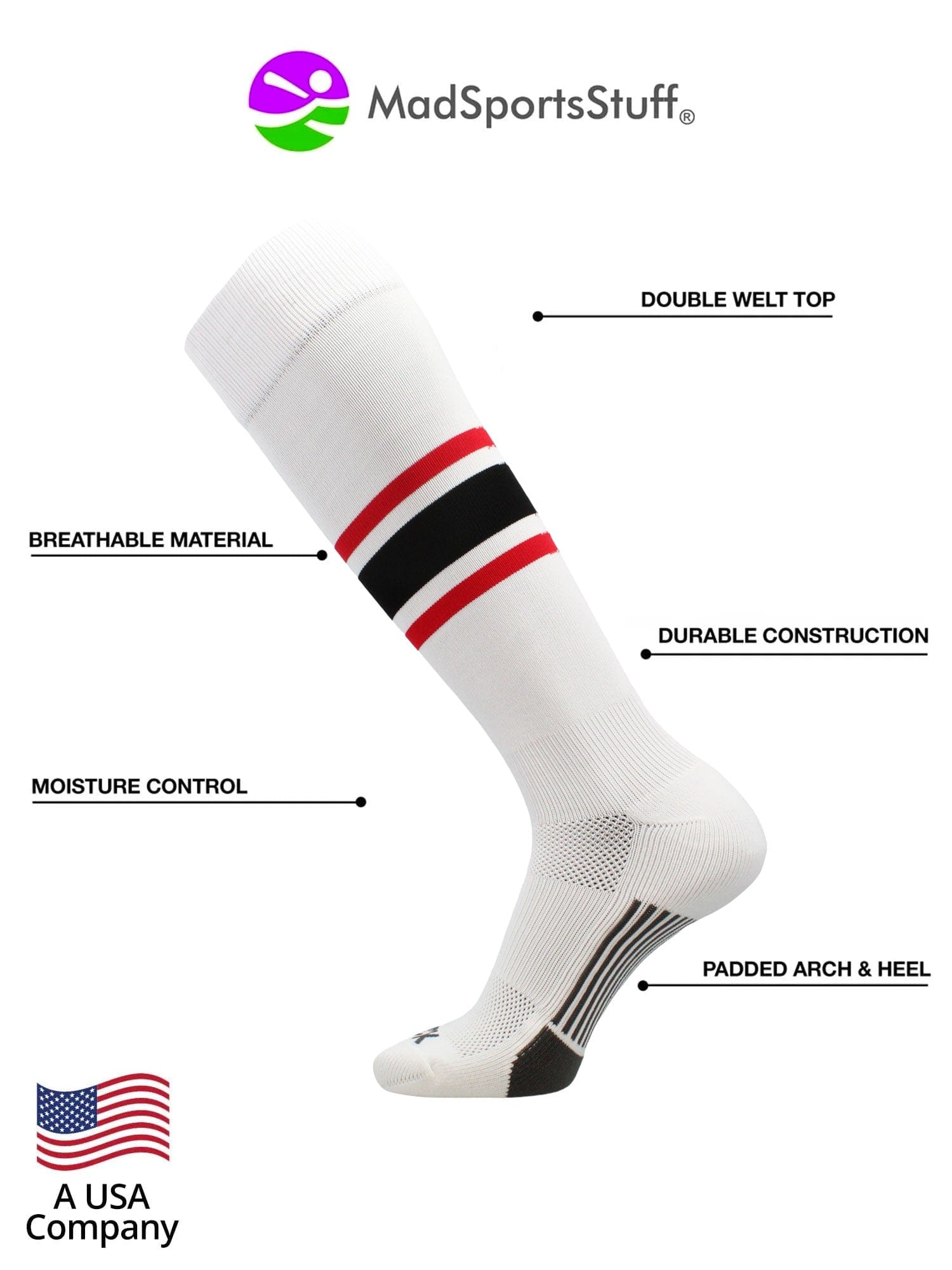 - PERFECT BASEBALL or SOFTBALL SOCKS: MadSportsStuff created world class baseball socks in a classic 3 stripe design and over the calf length. These baseball socks are offered in classic team colors and are sure to be a hit with your favorite baseball or softball player! These are also an excellent choice for team socks.