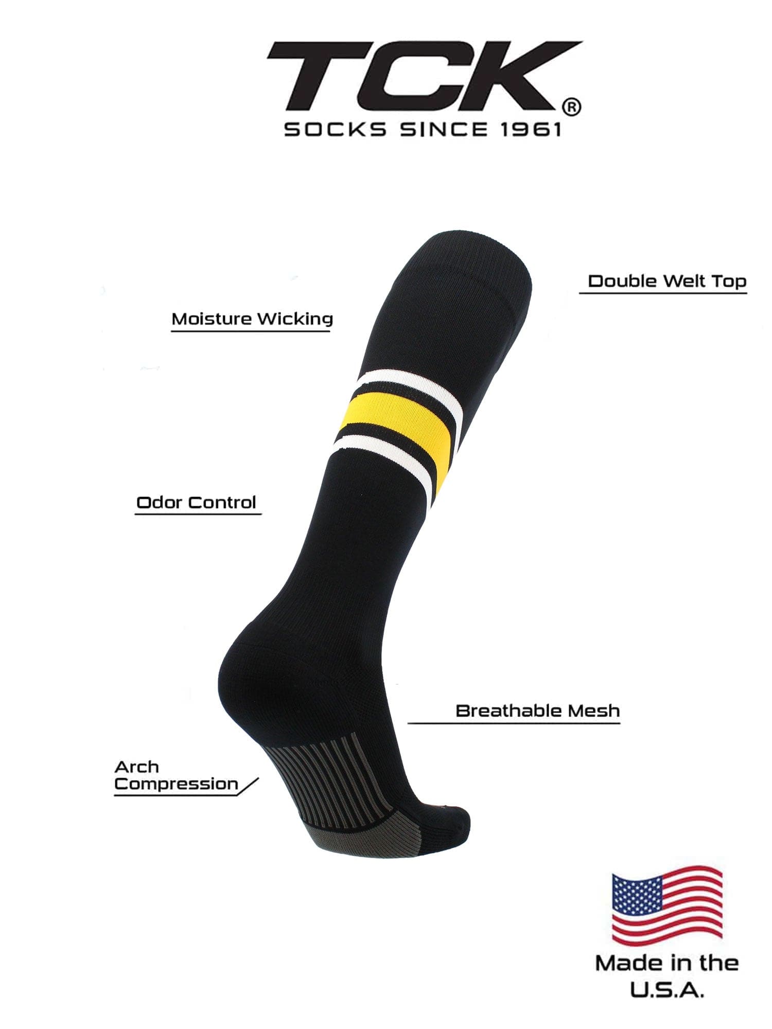 - QUALITY CONSTRUCTION: Our Dugout 3 Stripe Baseball Socks are made with love in the USA. ***NOTE- Please be aware any products produced with stripes (Socks or Stirrups) WILL have an overlap/stairstep stitching area on every stripe. This is inherent to the knitting process and is unavoidable. Please note this is NOT a defect in the product.***
