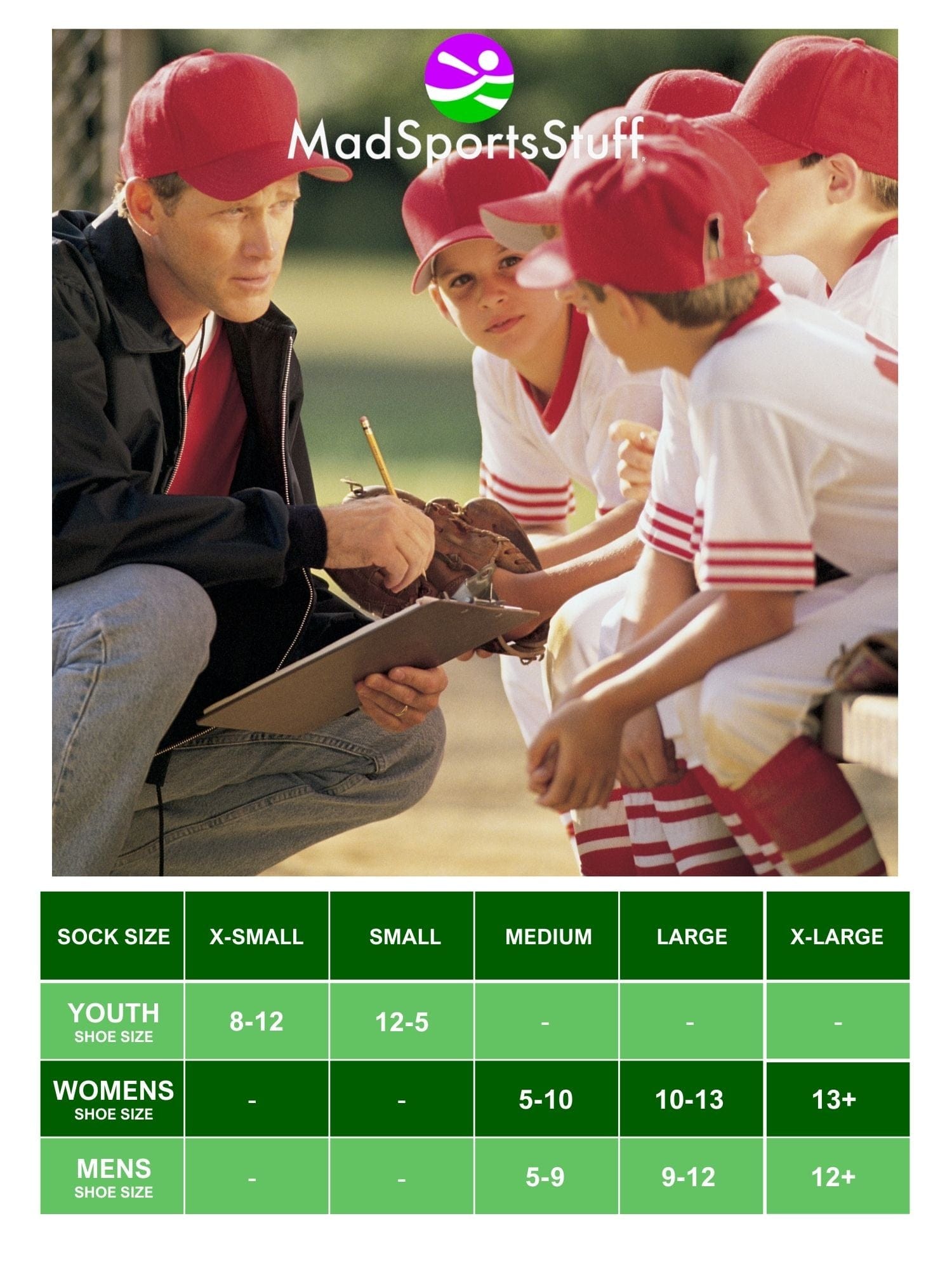 - ACCURATE SIZING: MadSportsStuff Sock Size: Small - Youth Shoe Size 12-5, Medium - Womens Shoe Size 5-10 Mens Shoe Size 5-9, Large - Womens Shoe Size 10-13 Mens Shoe Size 9-12, X-Large Womens Shoe Size 13+ Mens Shoe Size 12+
