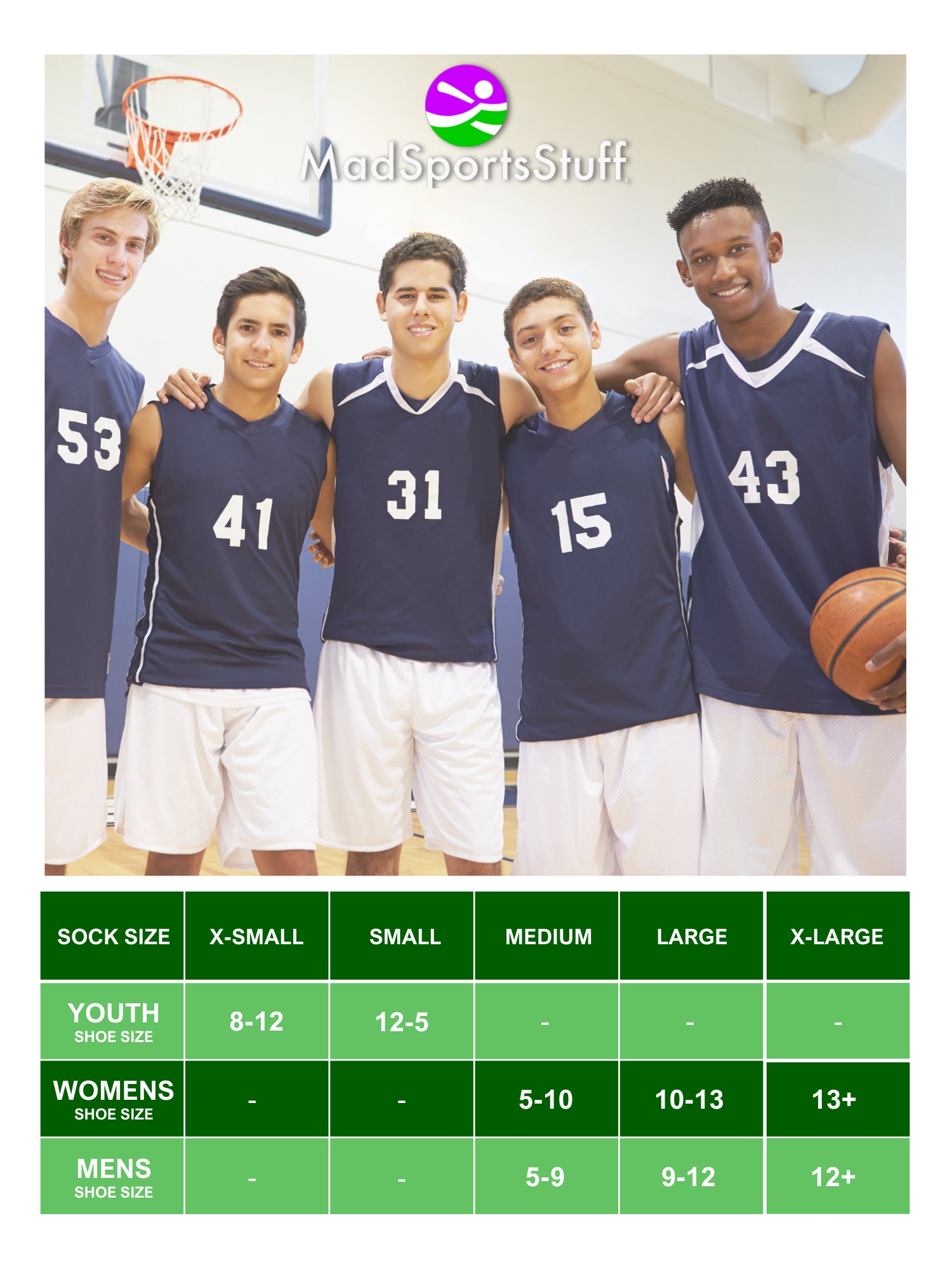 • While other athletic crew socks advertise one size fits most – often you instead receive basketball team socks that are too long, too small or too tight around the calves. Madsportsstuff sports socks come in standard sizes that are accurate to fit, small (youth shoe size 12-5); med (women shoe size 5-10); large (men shoe size 9-12); & extra large (women shoe size  13+; men shoe size 12+). Whether for outdoor basketball fun or any other activity, you get a great fitting sock every time.