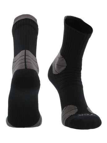 TCK Basketball Socks Crossover Performance Mens Quarter Socks Crew Length. High performance, moisture wicking, blister control, odor control, athletic crew socks for all team sports and elite athletes. Fit goes by shoe size: Small fits Youth 12-5; Medium fits Mens 6-9 or Womens 7-10; Large fits Mens 9-12 or Womens 10-13; X-Large fits Mens 12-15 or Womens 13+. High quality fiber contents: 77% Polypropylene, 17% Nylon, 3% Elastic, 3% Lycra Spandex. Made in USA.