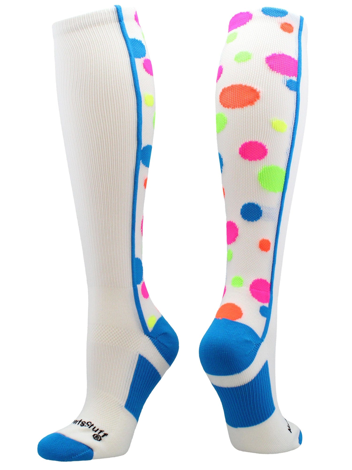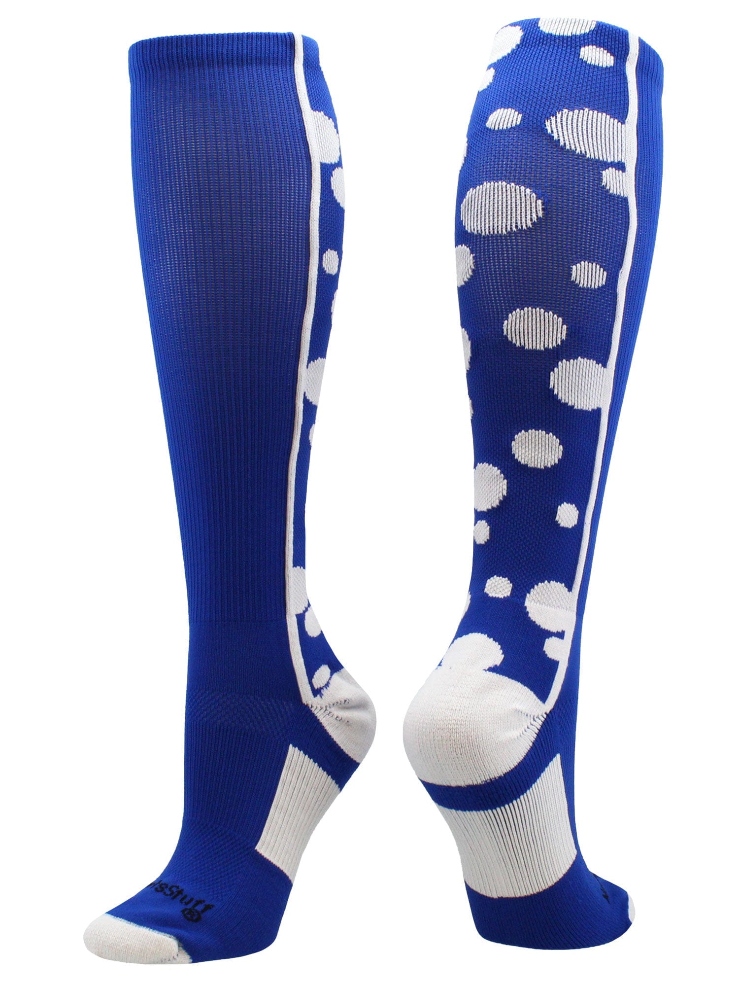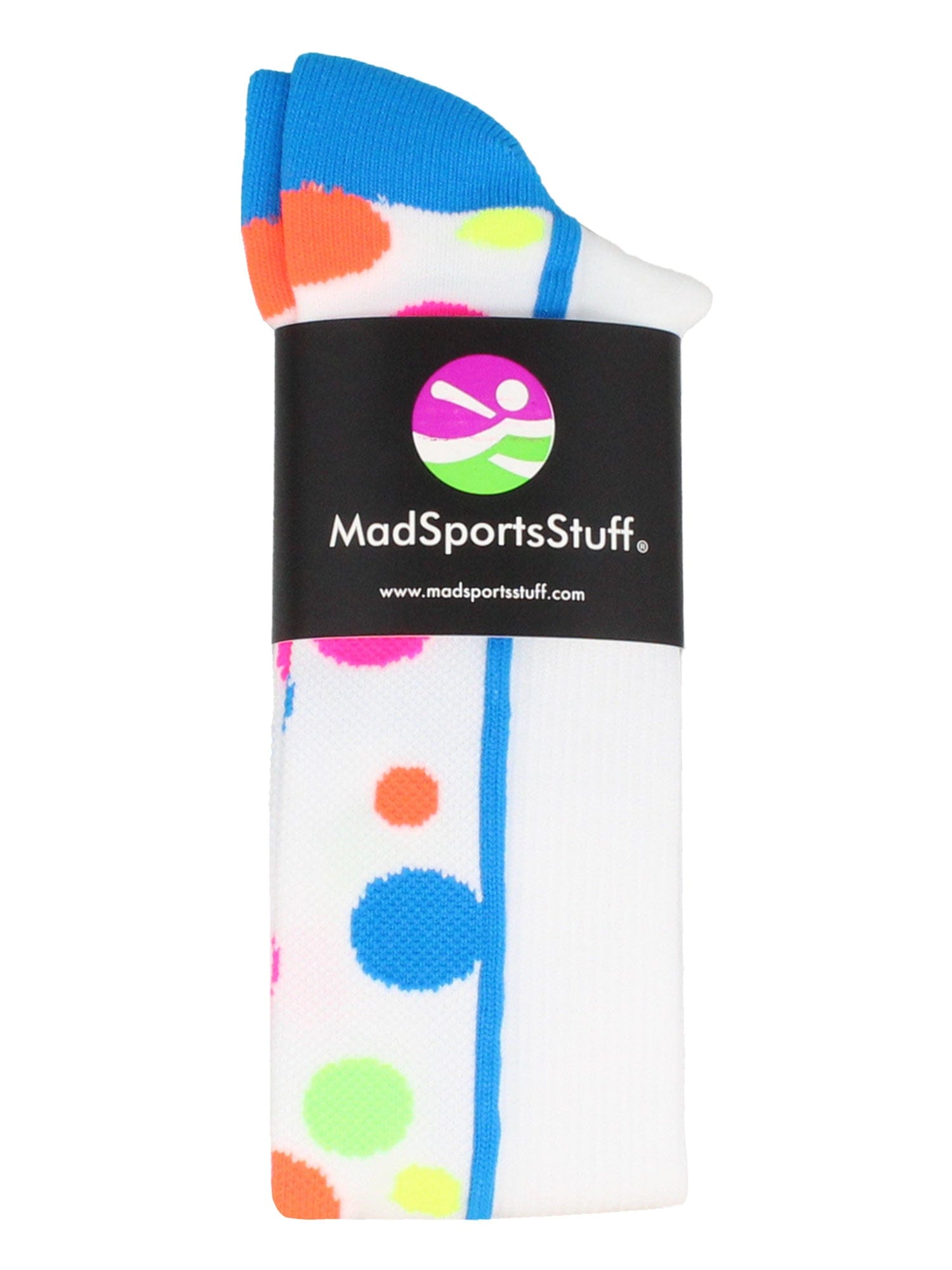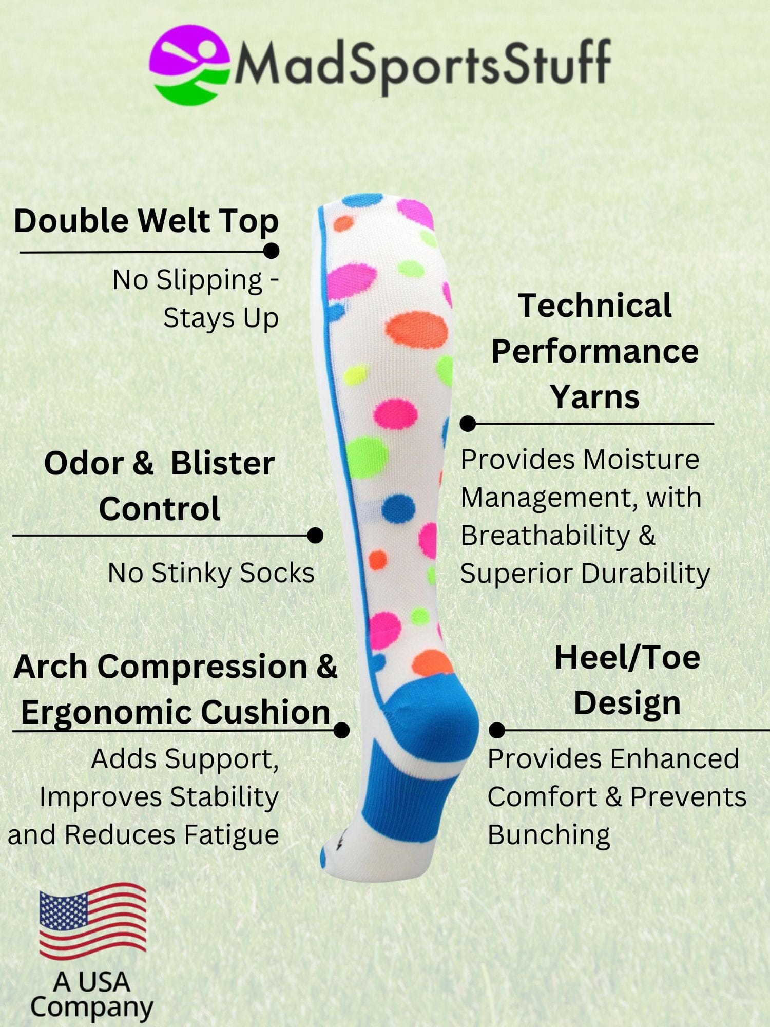 MadSportsStuff Crazy Dots Over the Calf Socks. High performance athletic socks for all team sports and elite athletes. Great for teams! Ideal for softball,baseball, lacrosse, basketball, field hockey, volleyball, wrestling, soccer, football, cheer, kickball and more!