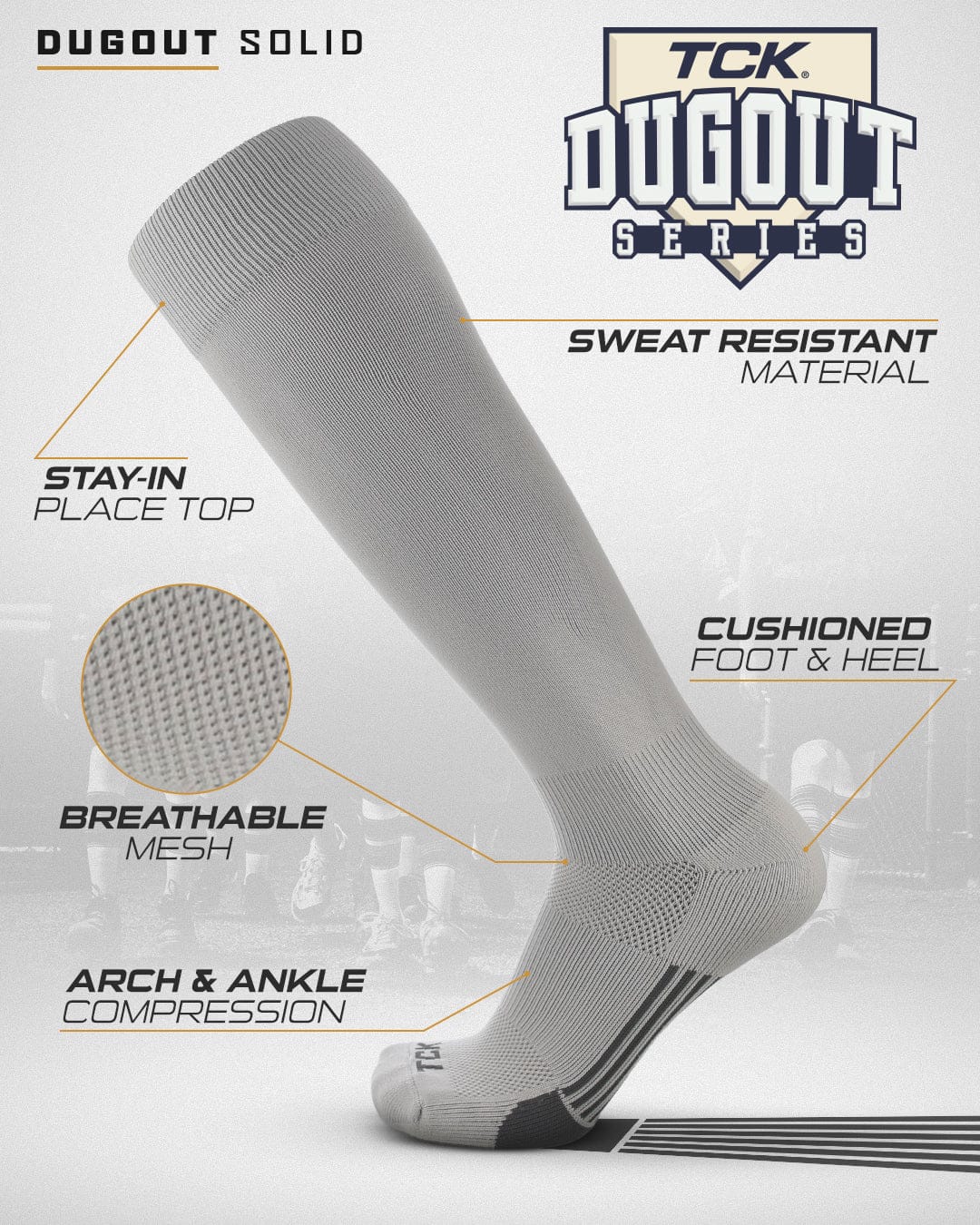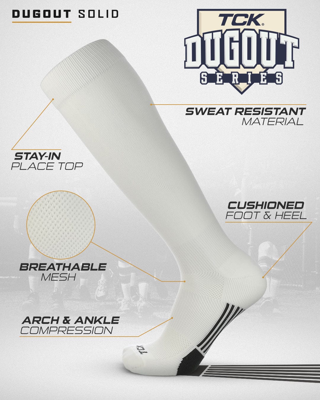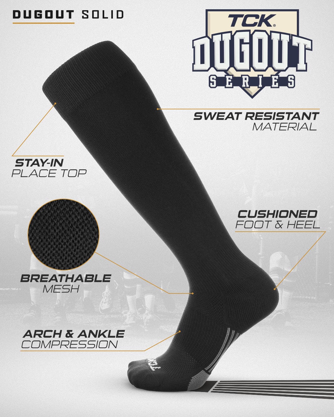 TCK Sports Dugout Series Baseball Softball Socks is a performance knee high baseball sock in solid colors. High performance, moisture wicking, blister control, arch and ankle compression, double welt top to keep sock secure, smooth toe seam, season long durability, ergonomic cushioning, athletic over the calf socks for all baseball, softball, fastpitch, team sports and elite athletes. Made in USA.
