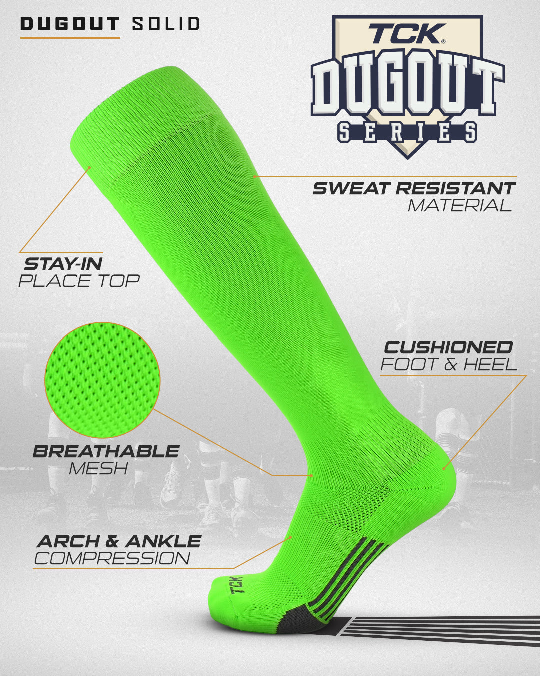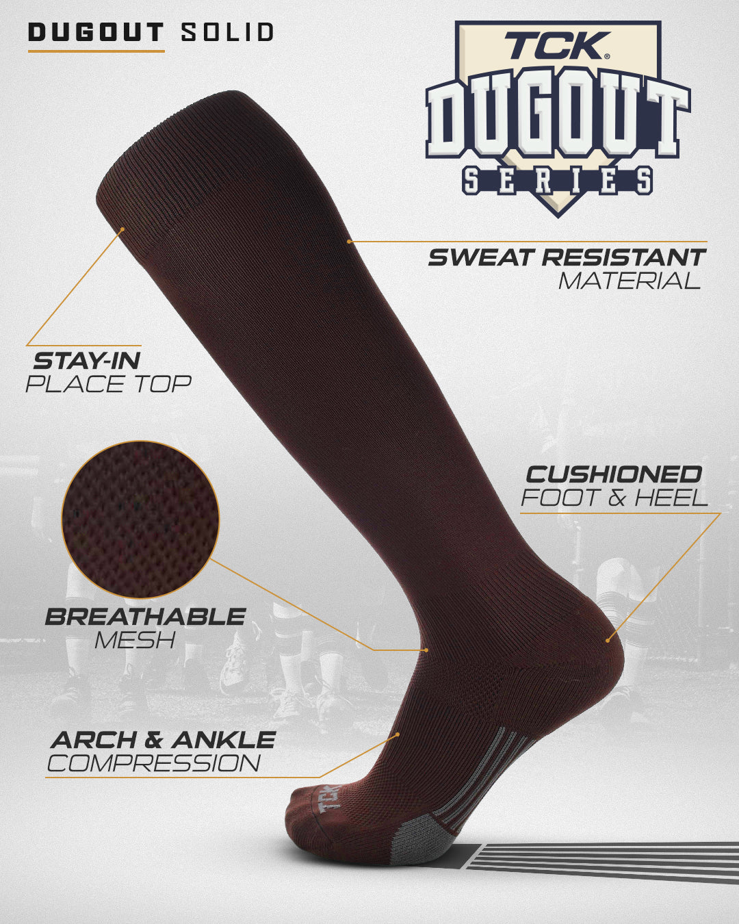 TCK Sports Dugout Series Baseball Softball Socks is a performance knee high baseball sock in solid colors. High performance, moisture wicking, blister control, arch and ankle compression, double welt top to keep sock secure, smooth toe seam, season long durability, ergonomic cushioning, athletic over the calf socks for all baseball, softball, fastpitch, team sports and elite athletes. Made in USA.