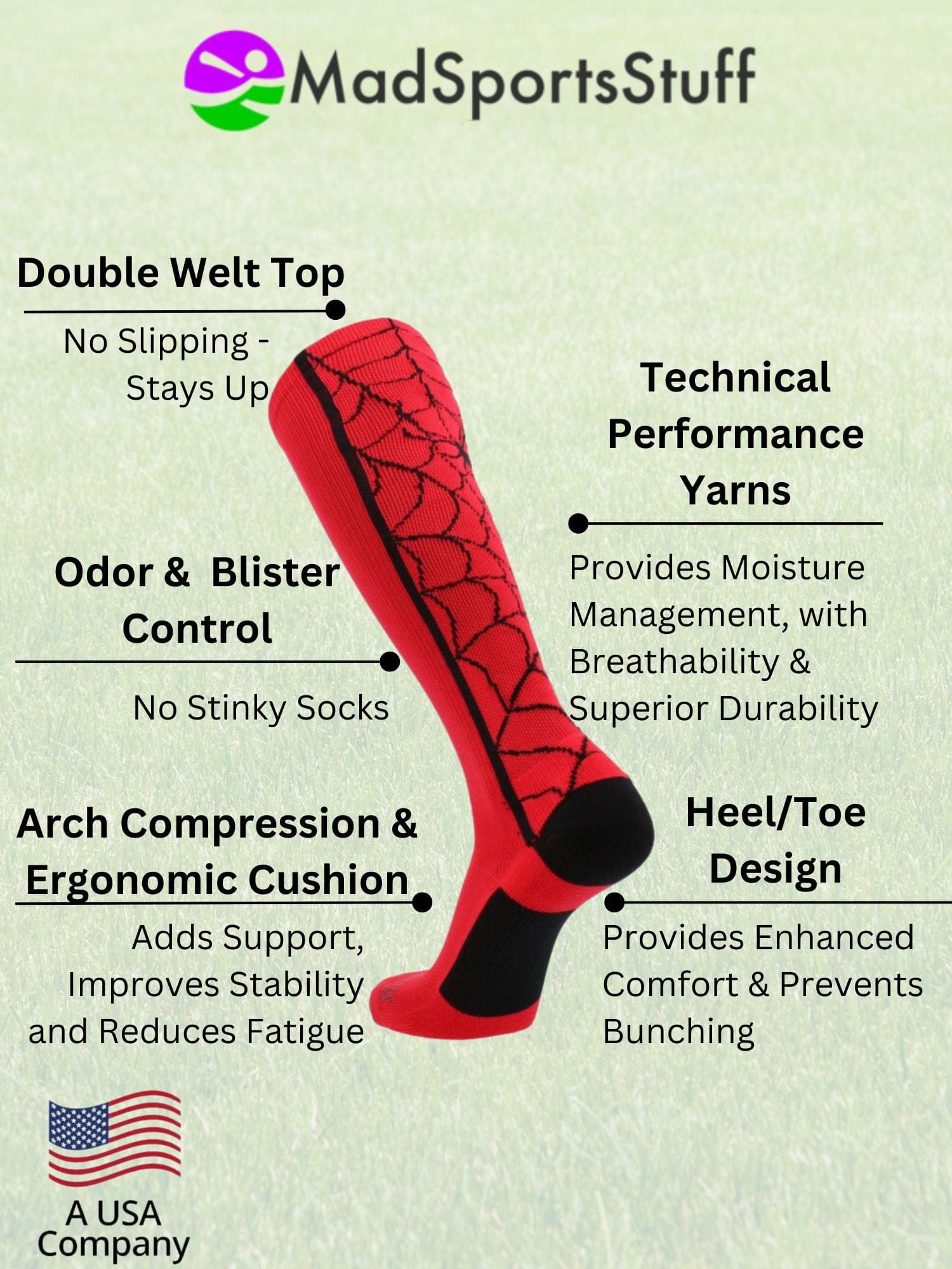 MadSportsStuff Crazy Spider Web Over the Calf Athletic Socks. High performance athletic socks for all team sports and elite athletes. For boys or girls, teams and gifts. Ideal for softball, baseball, lacrosse, basketball, wrestling, soccer, football, kickball and more!