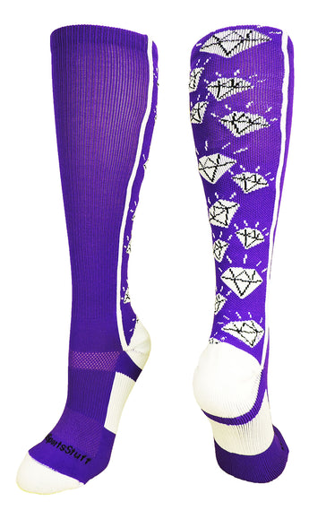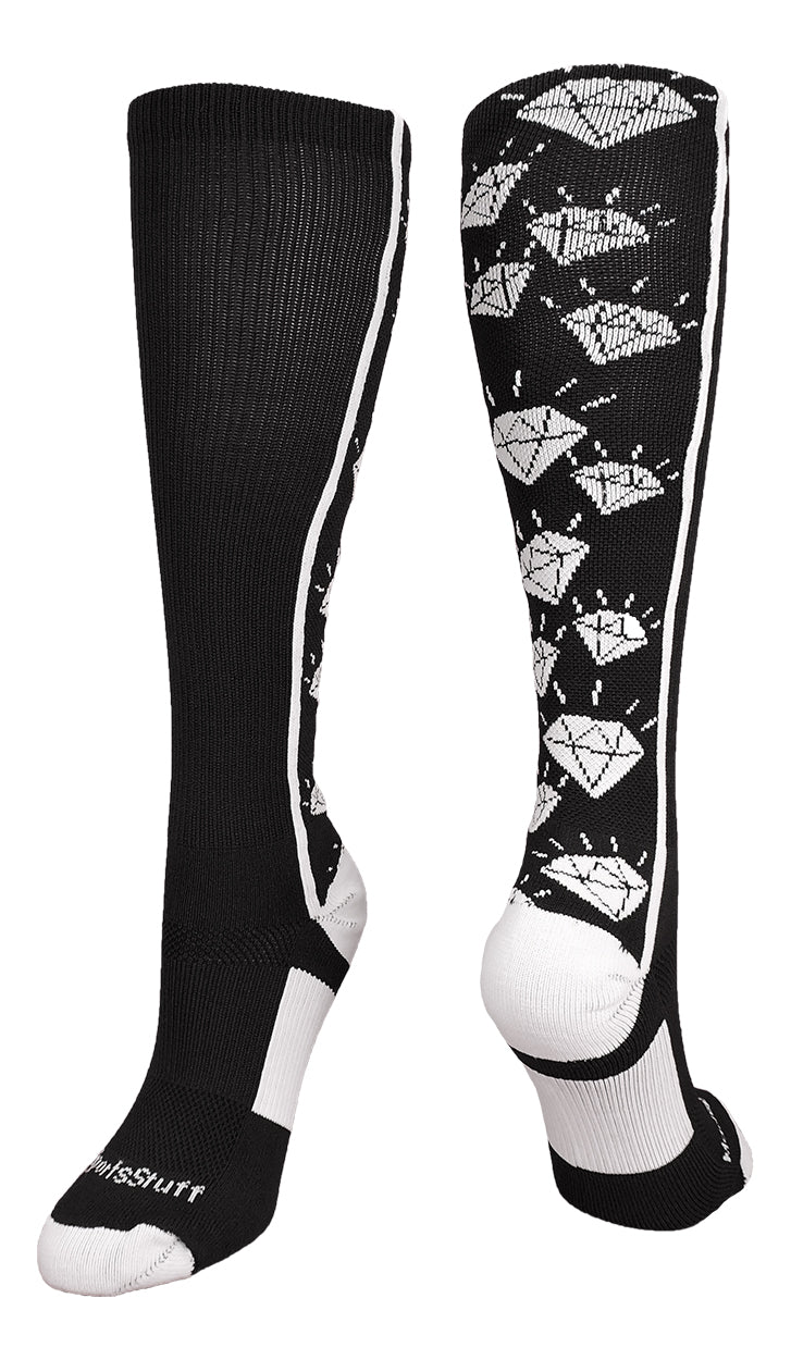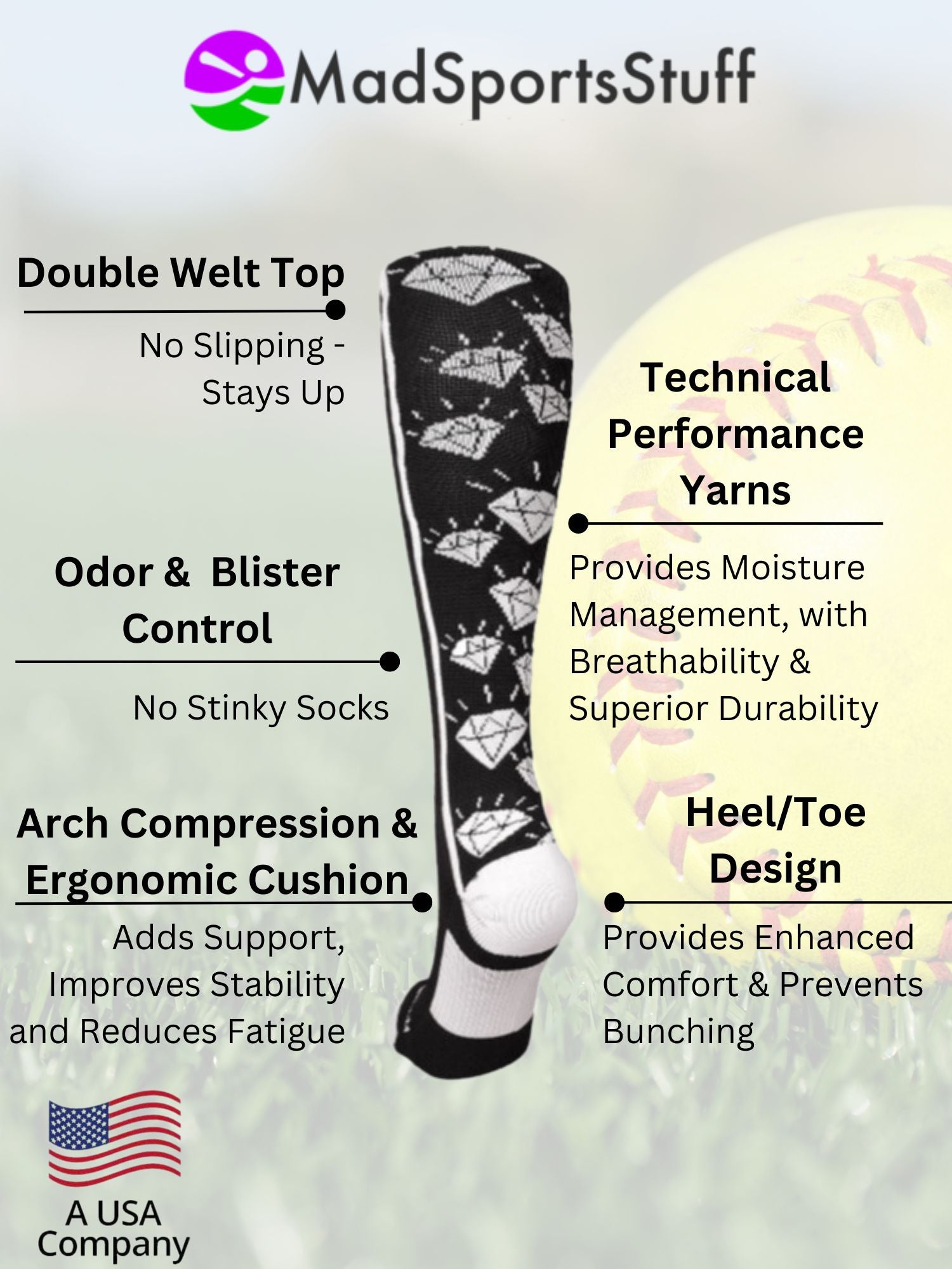 MadSportsStuff Socks with Diamonds in an over the calf length. High performance athletic socks for all team sports and elite athletes. Great for teams! Ideal for softball, soccer, field hockey, volleyball, lacrosse, cheer, dance and more!