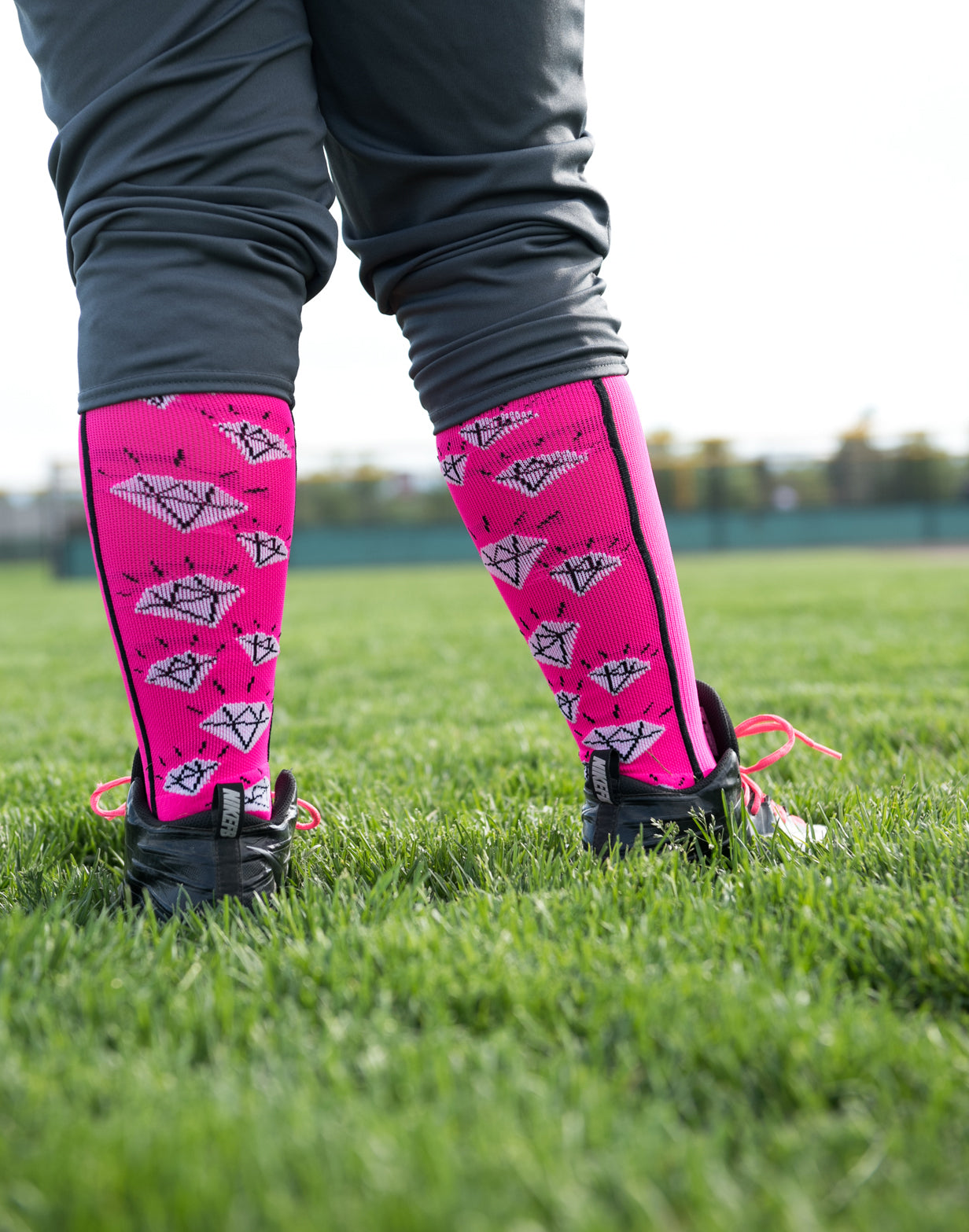 - PERFECT SPORTS SOCKS: Add a little bling to your game with our crazy, fun, diamond over the calf socks. Great for softball, t-ball, soccer, volleyball, lacrosse, cheer and more!