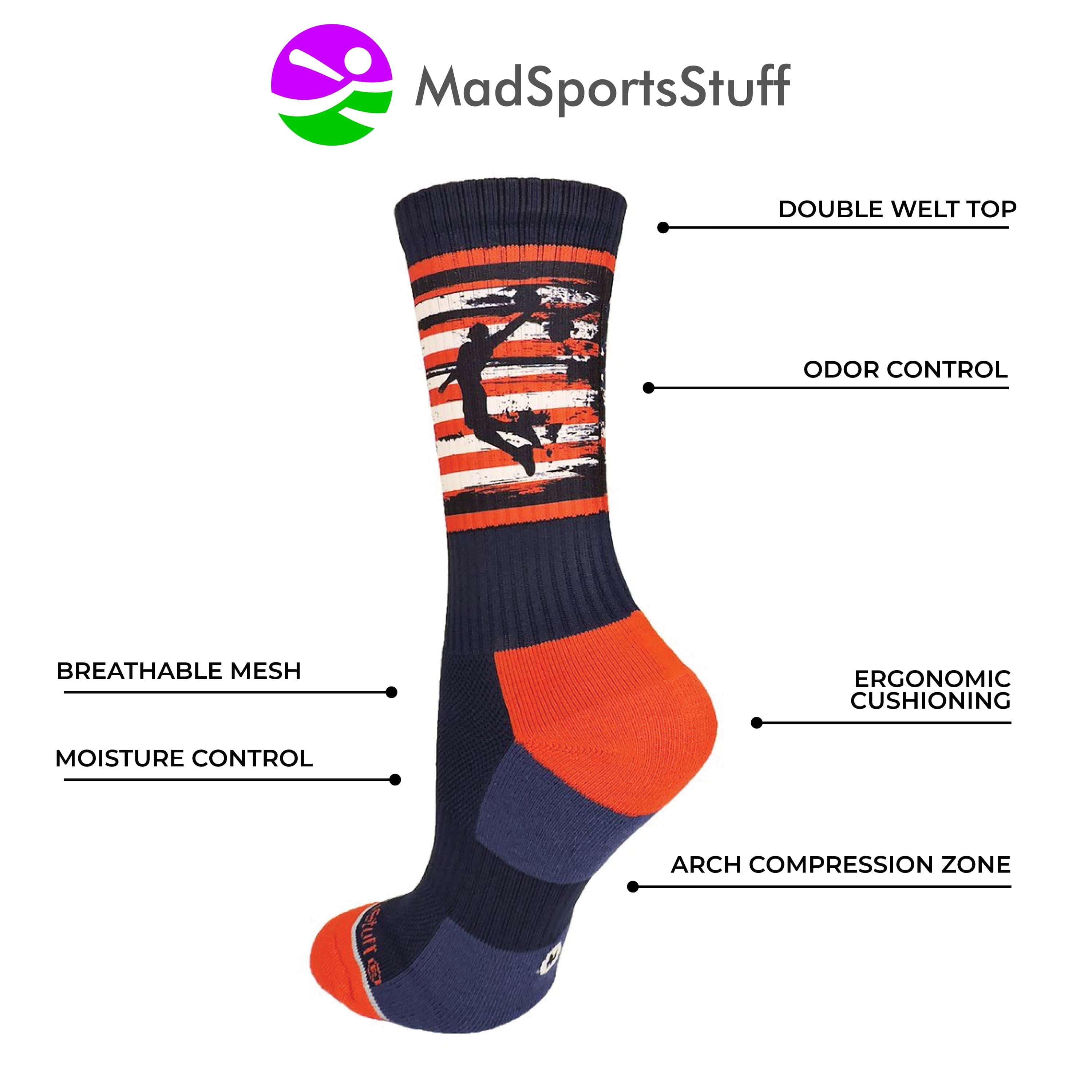 MadSportsStuffCrew length USA Basketball Socks with American Flag and Player. High performance athletic socks for all team sports and elite athletes. For boys or girls, great for teams and gifts!