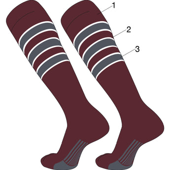 Custom Dugout Striped Baseball Socks Pattern D. Customize with your own team colors and logo to make the perfect Baseball Socks or Softball Socks. High performance athletic socks for all team sports and elite athletes. Shoe Size: Small - Youth 12-5 Womens 4-7, Medium - Womens 7-10 Mens 6-9, Large - Womens 10-13 Mens 9-12, X-Large Womens 13+ Mens 12+.
