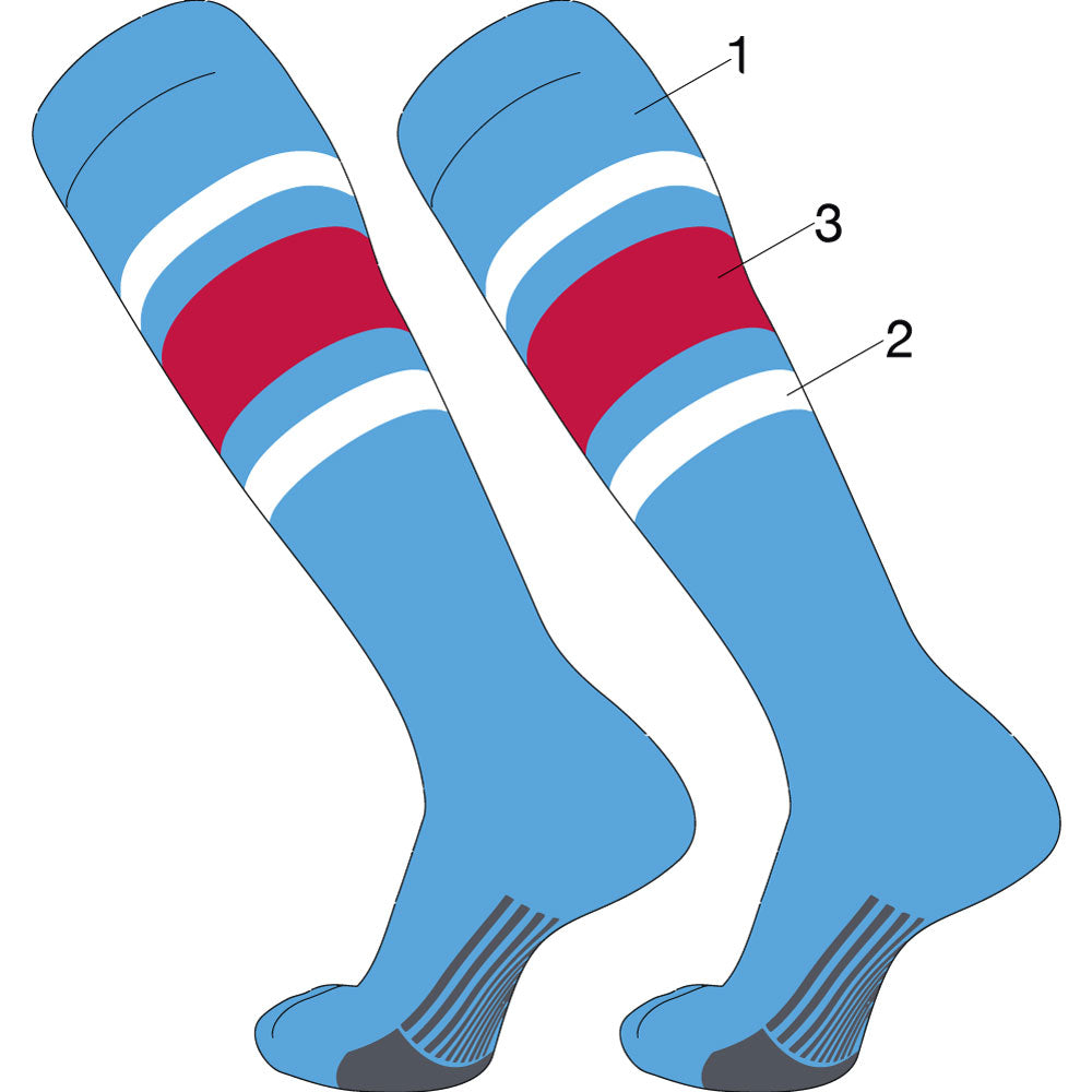 Custom Dugout Striped Baseball Socks Pattern E. Customize with your own team colors and logo to make the perfect Baseball Socks or Softball Socks. High performance athletic socks for all team sports and elite athletes. Shoe Size: Small - Youth 12-5 Womens 4-7, Medium - Womens 7-10 Mens 6-9, Large - Womens 10-13 Mens 9-12, X-Large Womens 13+ Mens 12+.
