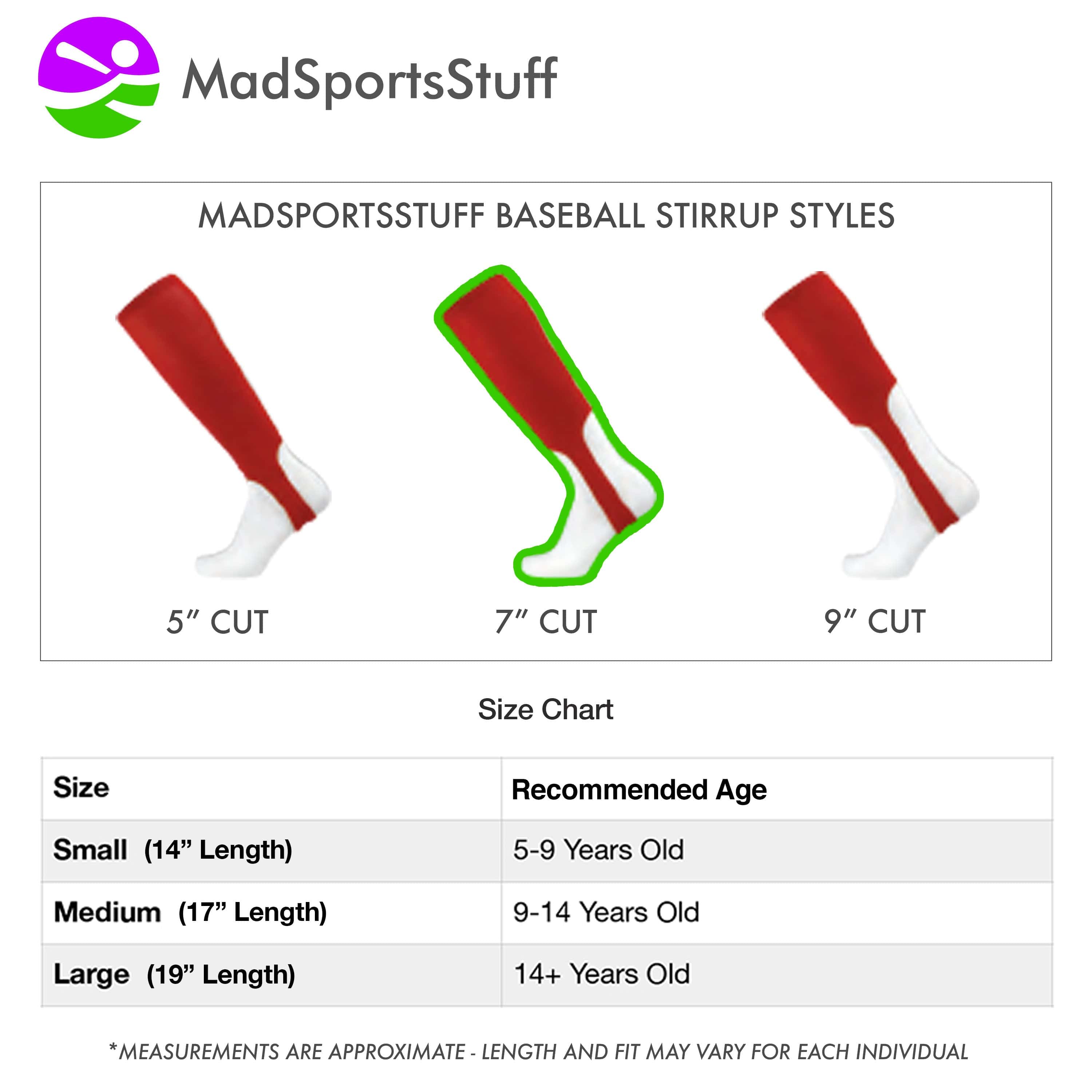 - ADDITIONAL DETAILS: Standard baseball stirrup profile, fits over athletic socks (socks not included). ***NOTE- Please be aware any products produced with stripes (Socks or Stirrups) WILL have an overlap/stairstep stitching area on every stripe. This is inherent to the knitting process and is unavoidable. Please note this is NOT a defect in the product. These baseball stirrups are the same baseball stirrups worn on the field by Major League Baseball players and the overlap is rarely noticed.***