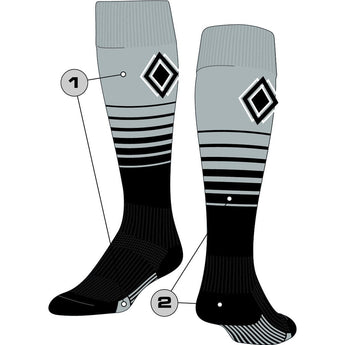 Custom Breaker Over the Calf Soccer Socks. High performance athletic socks for all team sports and elite athletes. Shoe Size: Small - Youth 12-5 Womens 4-7, Medium - Womens 7-10 Mens 6-9, Large - Womens 10-13 Mens 9-12, X-Large Womens 13+ Mens 12+.
