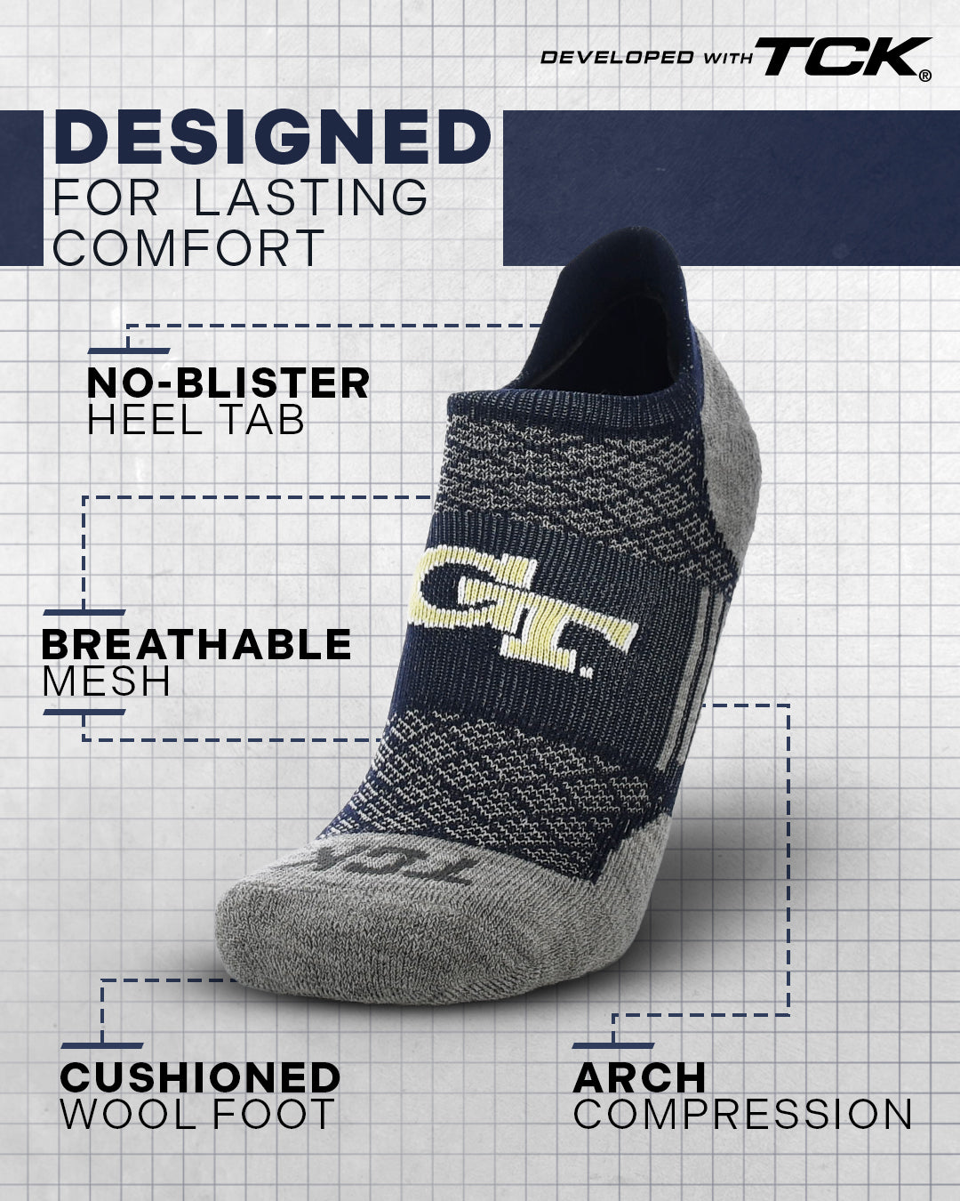 Step up your sock game with TCK's Georgia Tech Yellow Jacket no show socks, high performance NCAA sock made in the USA. Designed for sneakerheads, golfers, runners, and fans alike, these socks feature a soft merino wool footbed, breathable mesh upper, arch support, and a smooth toe seam. The heel tab protects without showing. Perfect for all-day comfort, year-round wear, and gifting for birthdays, Father's Day, grads, or Christmas.
