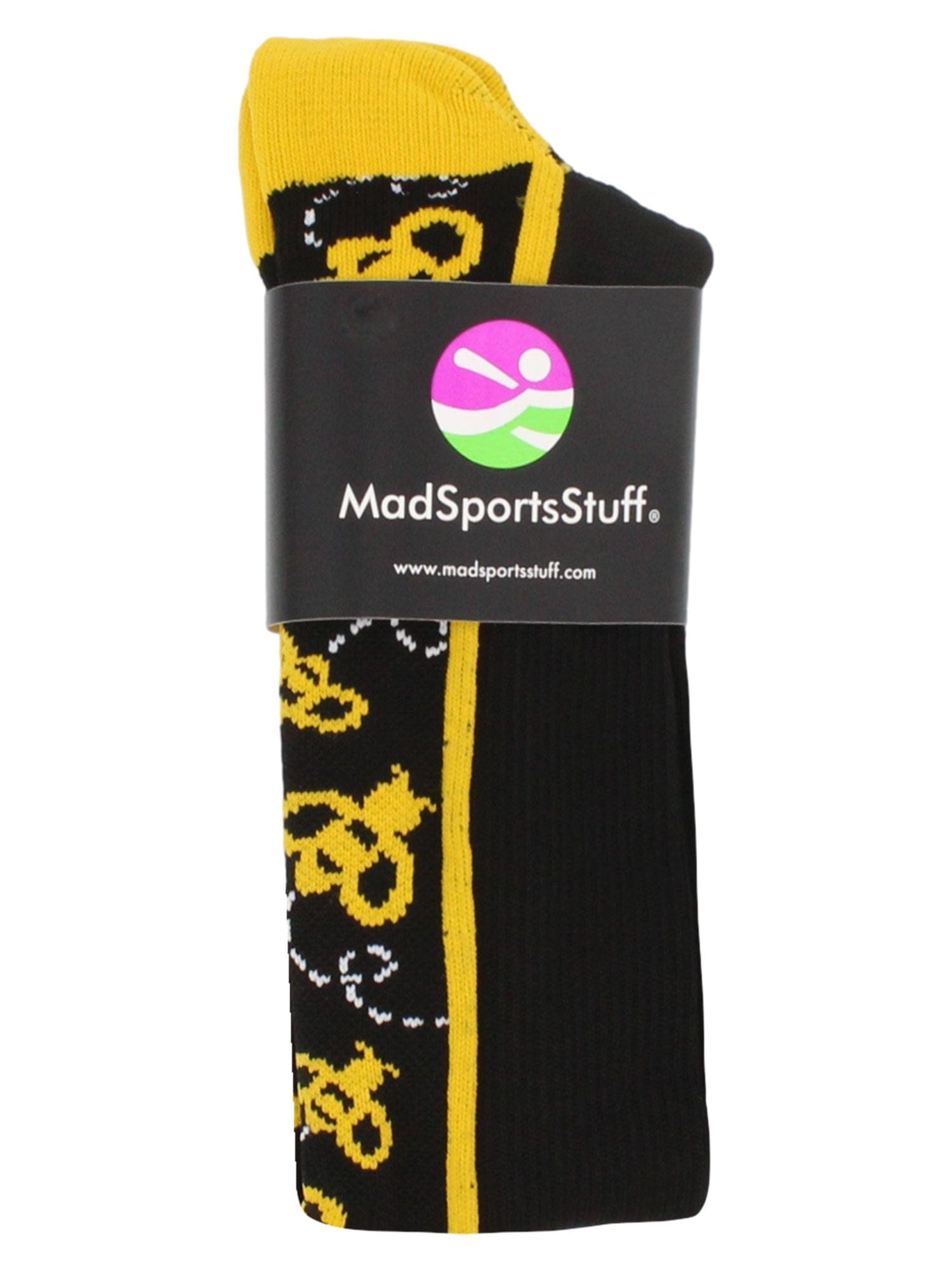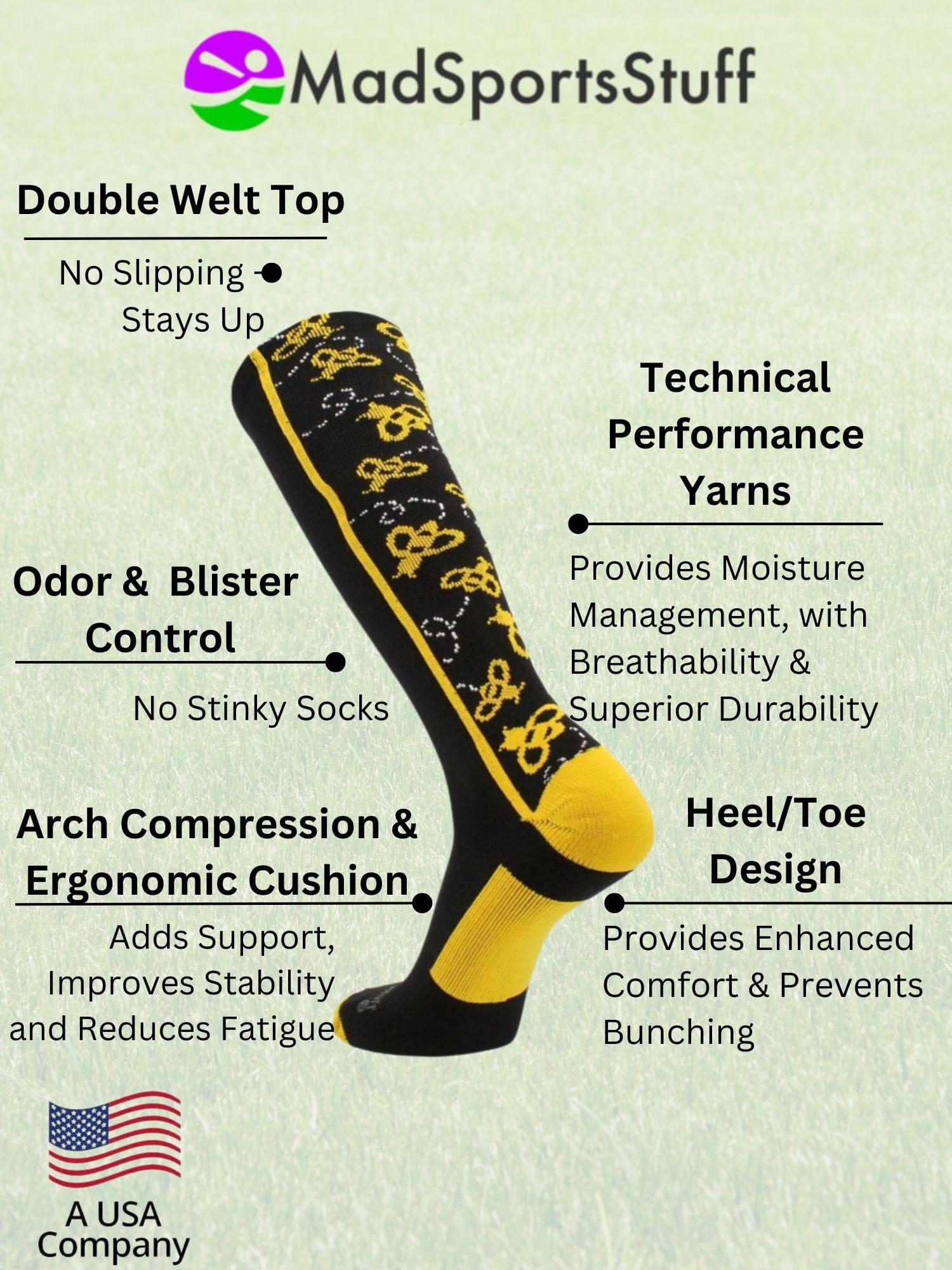 MadSportsStuff Crazy Bumble Bee Over the Calf Socks. High performance athletic socks for all team sports and elite athletes. For boys or girls, teams and gifts. Ideal for softball, baseball, lacrosse, basketball, field hockey, volleyball, soccer, cheer, kickball and more!
