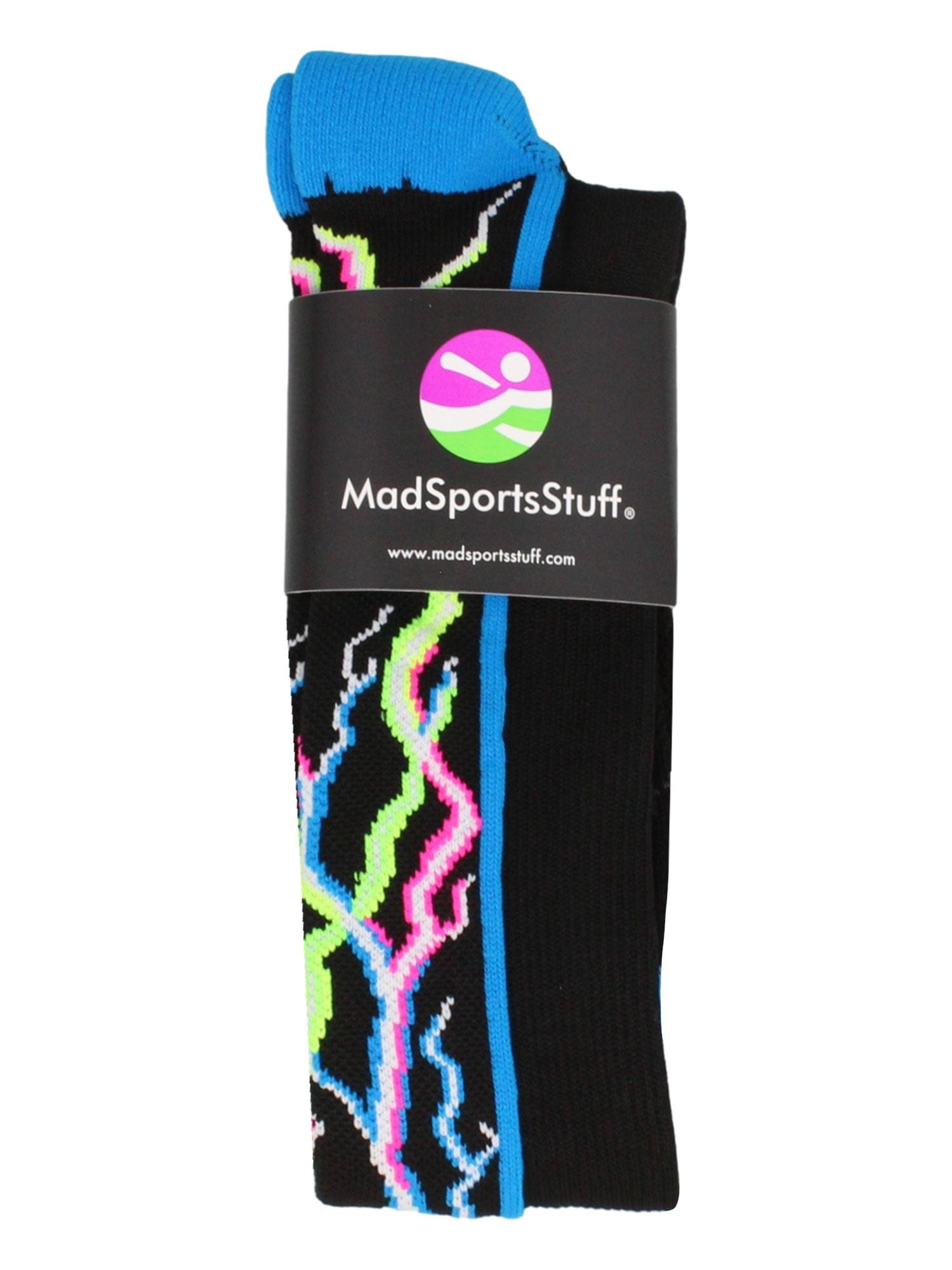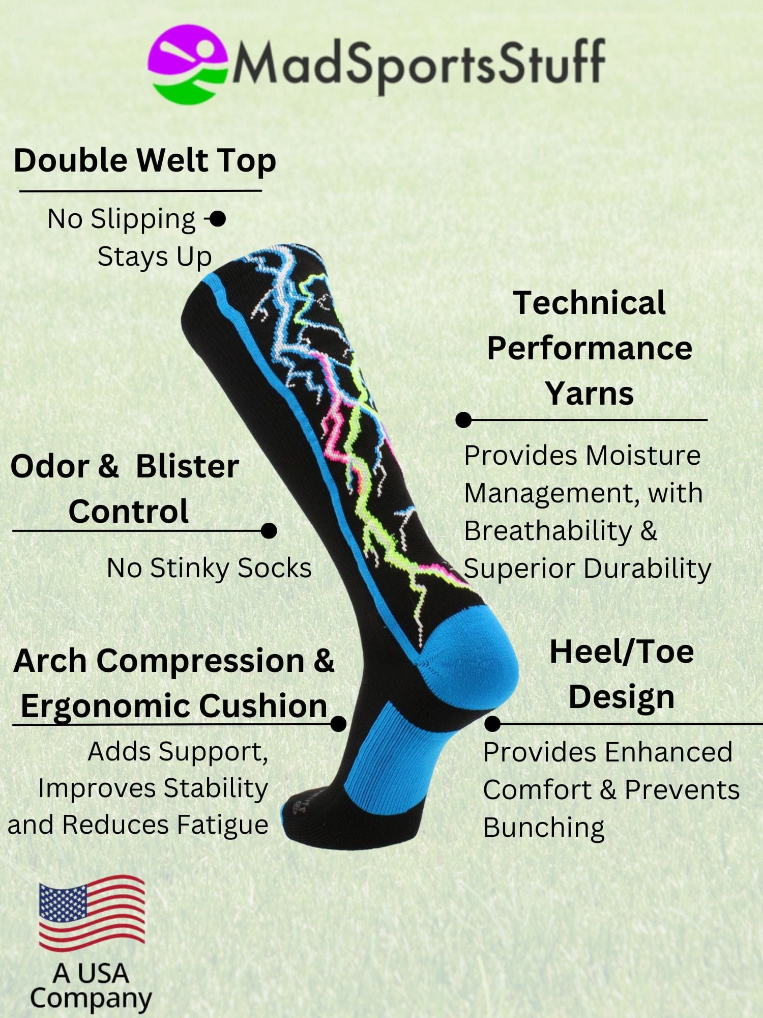 MadSportsStuff Crazy Socks with Lightning Bolts Electric Storm Over the Calf. High performance athletic socks for all team sports and elite athletes. For boys or girls, teams and gifts. Ideal for softball, baseball, lacrosse, basketball, field hockey, volleyball, wrestling, soccer, football, cheer, kickball and more!