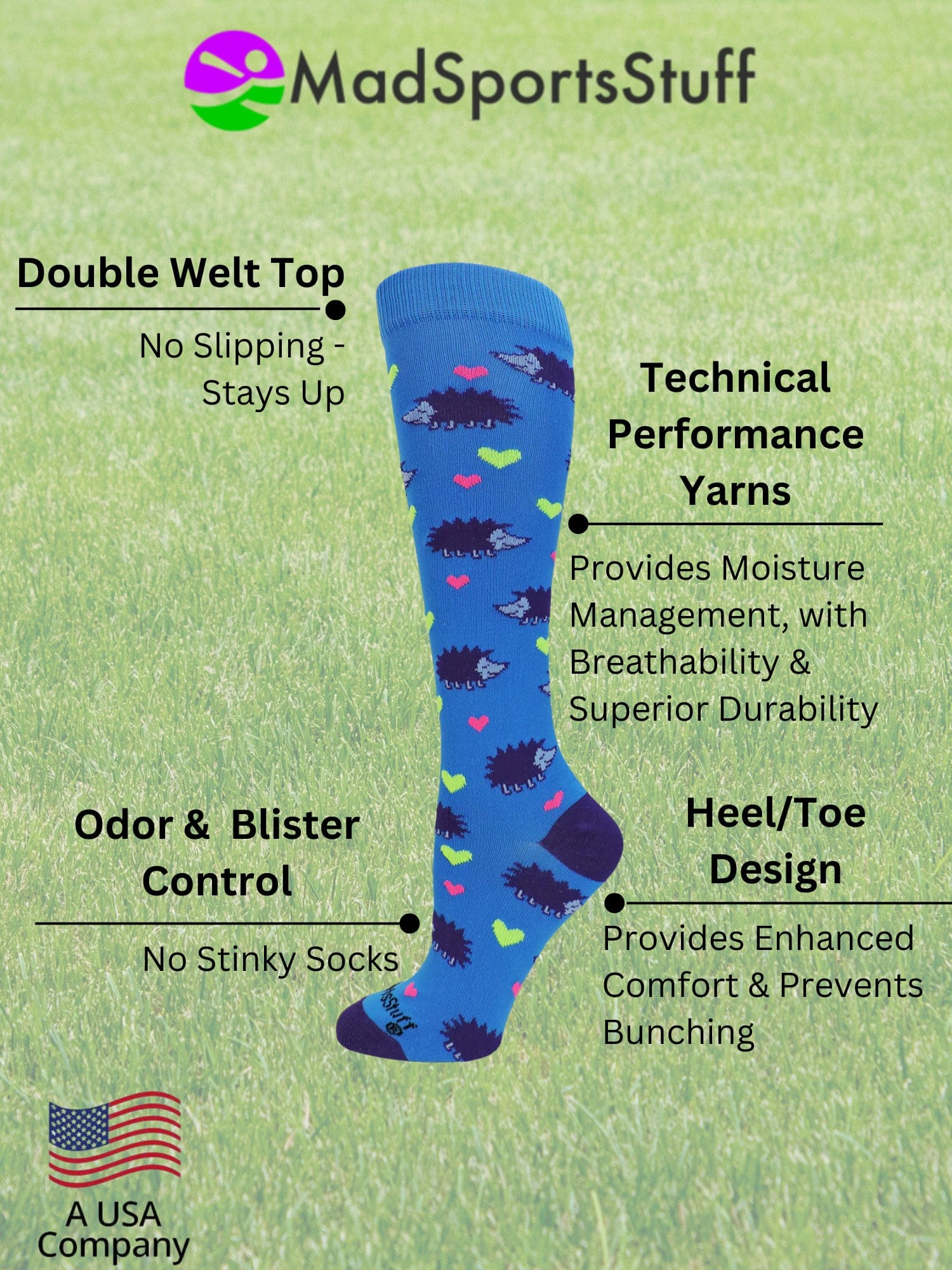 MadSportsStuff Hedgehog Love Over the Calf Athletic Socks. High performance athletic socks for all team sports and elite athletes. Ideal for softball, lacrosse, basketball, field hockey, volleyball, soccer, cheer, kickball and more!
