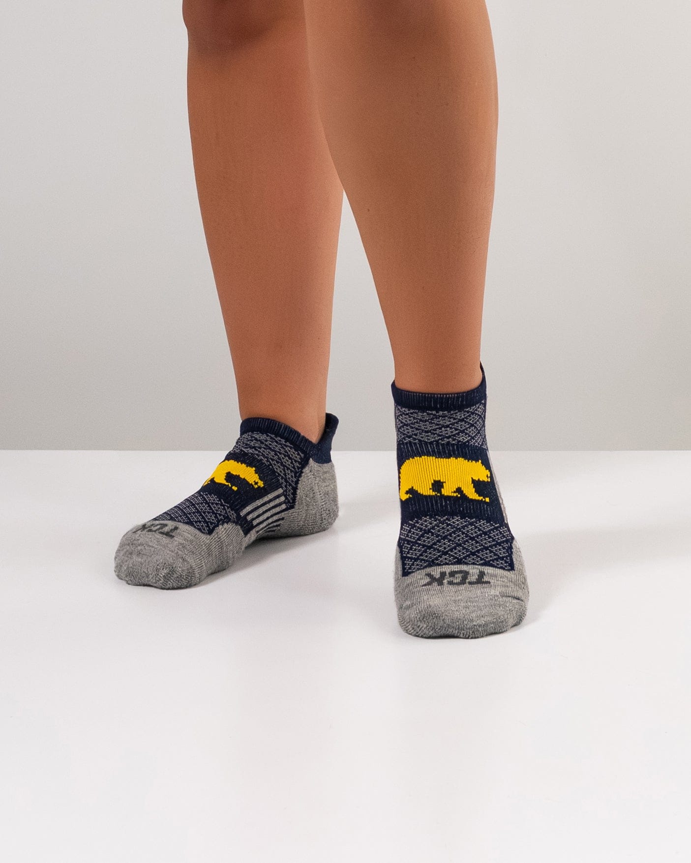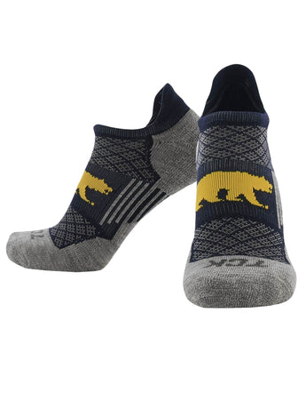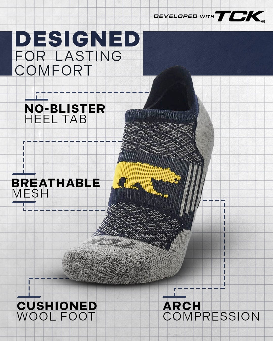 Step up your sock game with TCK's California Golden Bears no show socks, high performance NCAA sock made in the USA. Designed for sneakerheads, golfers, runners, and fans alike, these socks feature a soft merino wool footbed, breathable mesh upper, arch support, and a smooth toe seam. The heel tab protects without showing. Perfect for all-day comfort, year-round wear, and gifting for birthdays, Father's Day, grads, or Christmas.