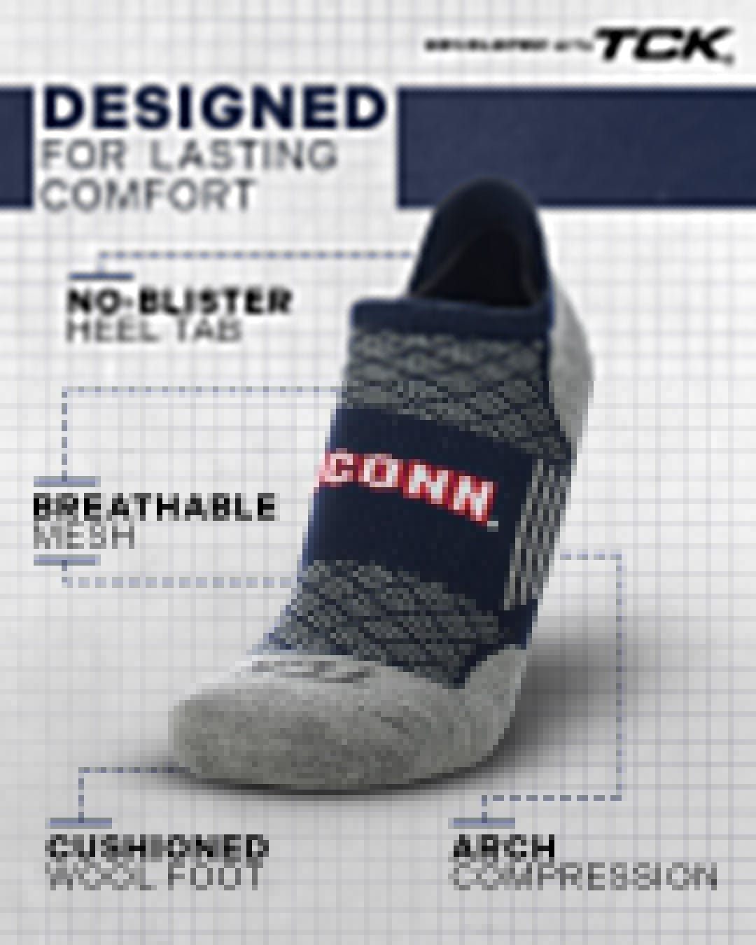 Step up your sock game with TCK's Connecticut Huskies no show socks, high performance NCAA sock made in the USA. Designed for sneakerheads, golfers, runners, and fans alike, these socks feature a soft merino wool footbed, breathable mesh upper, arch support, and a smooth toe seam. The heel tab protects without showing. Perfect for all-day comfort, year-round wear, and gifting for birthdays, Father’s Day, grads, or Christmas.