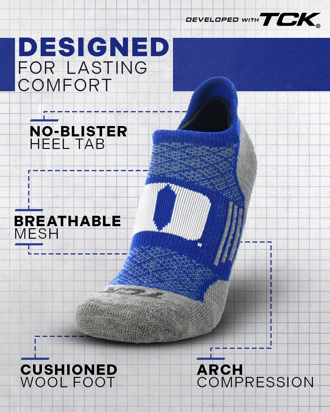 Step up your sock game with TCK's Duke Blue Devils no show socks, high performance NCAA sock made in the USA. Designed for sneakerheads, golfers, runners, and fans alike, these socks feature a soft merino wool footbed, breathable mesh upper, arch support, and a smooth toe seam. The heel tab protects without showing. Perfect for all-day comfort, year-round wear, and gifting for birthdays, Father’s Day, grads, or Christmas.