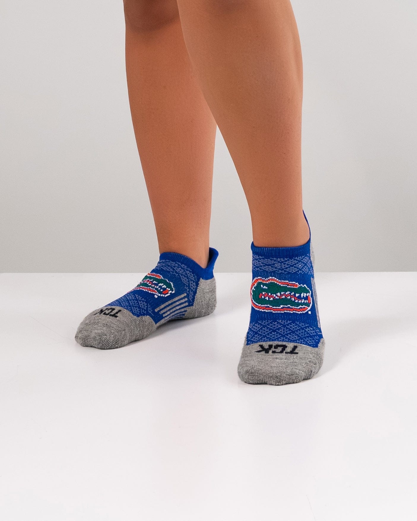 Step up your sock game with TCK's Florida Gators no show socks, high performance NCAA sock made in the USA. Designed for sneakerheads, golfers, runners, and fans alike, these socks feature a soft merino wool footbed, breathable mesh upper, arch support, and a smooth toe seam. The heel tab protects without showing. Perfect for all-day comfort, year-round wear, and gifting for birthdays, Father’s Day, grads, or Christmas.