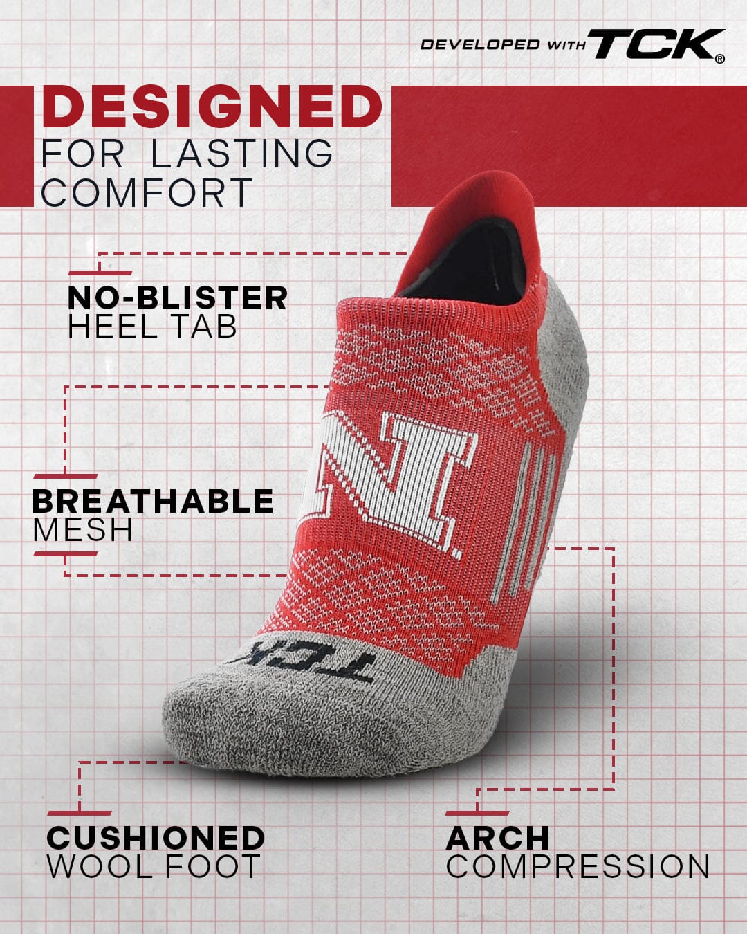Step up your sock game with TCK's Nebraska Cornhuskers no show socks, high performance NCAA sock made in the USA. Designed for sneakerheads, golfers, runners, and fans alike, these socks feature a soft merino wool footbed, breathable mesh upper, arch support, and a smooth toe seam. The heel tab protects without showing. Perfect for all-day comfort, year-round wear, and gifting for birthdays, Father's Day, grads, or Christmas.
