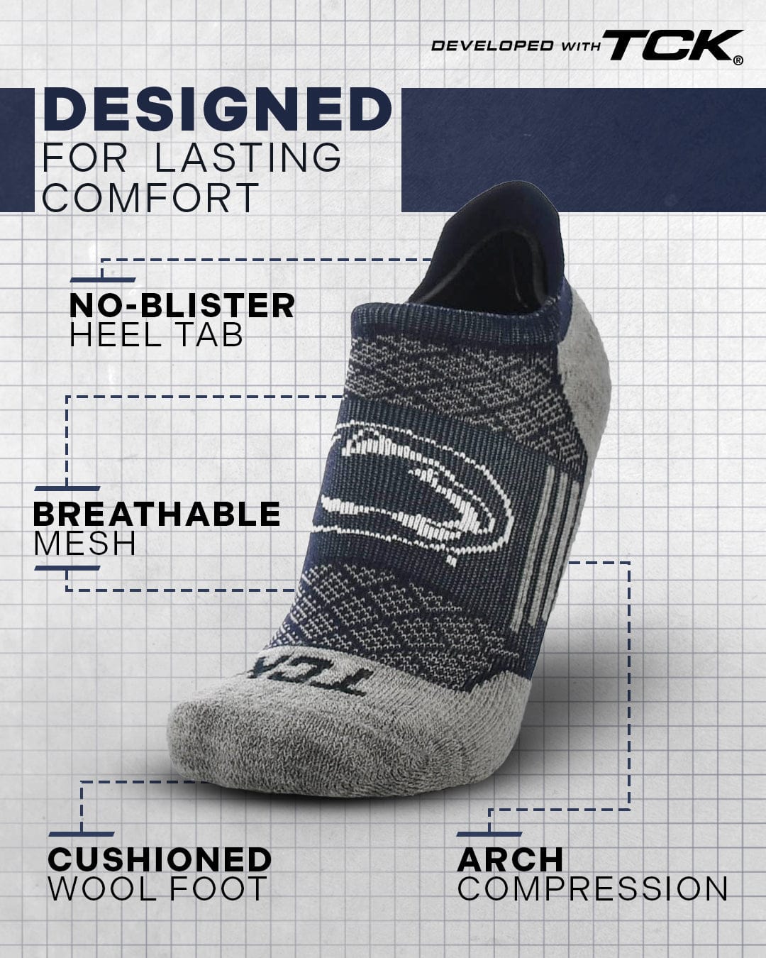 Step up your sock game with TCK's Penn State Nittany Lions no show socks, high performance NCAA sock made in the USA. Designed for sneakerheads, golfers, runners, and fans alike, these socks feature a soft merino wool footbed, breathable mesh upper, arch support, and a smooth toe seam. The heel tab protects without showing. Perfect for all-day comfort, year-round wear, and gifting for birthdays, Father's Day, grads, or Christmas.