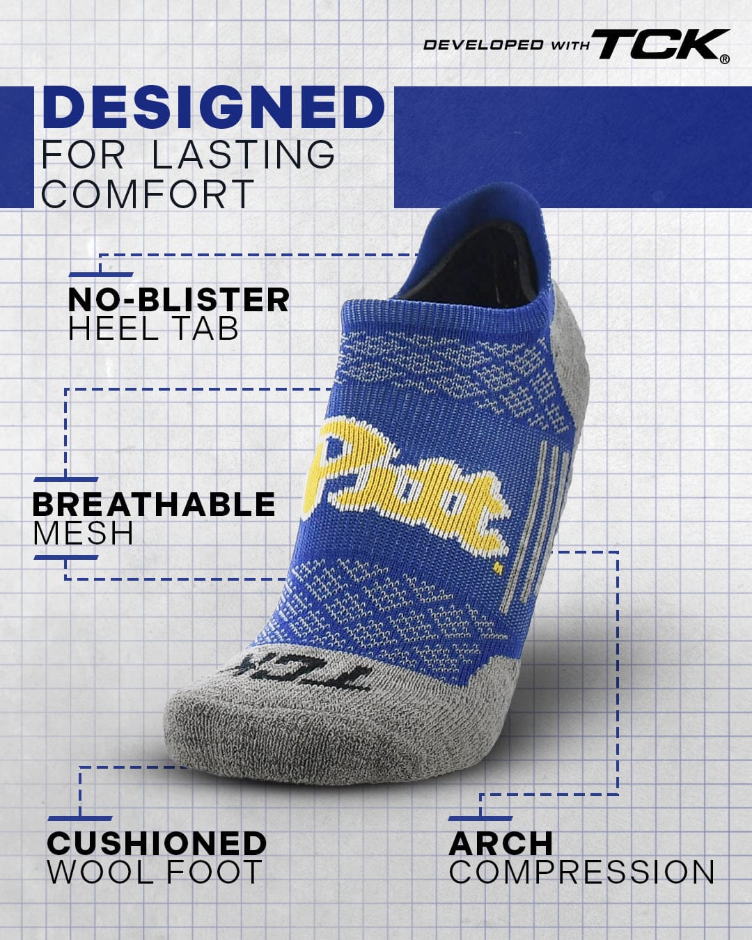 Step up your sock game with TCK's Pittsburgh Panthers no show socks, high performance NCAA sock made in the USA. Designed for sneakerheads, golfers, runners, and fans alike, these socks feature a soft merino wool footbed, breathable mesh upper, arch support, and a smooth toe seam. The heel tab protects without showing. Perfect for all-day comfort, year-round wear, and gifting for birthdays, Father's Day, grads, or Christmas.