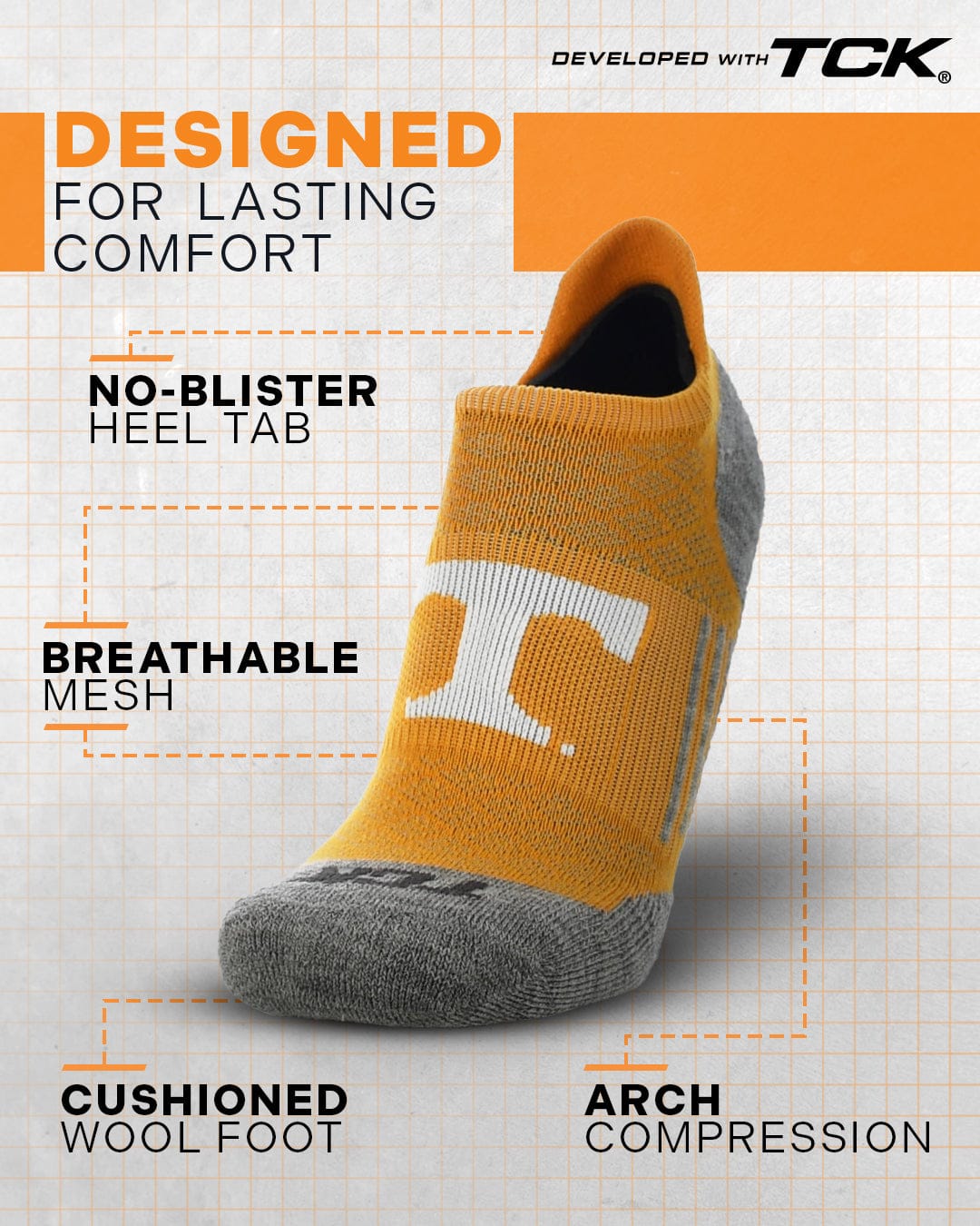 Step up your sock game with TCK's Tennessee Volunteers no show socks, high performance NCAA sock made in the USA. Designed for sneakerheads, golfers, runners, and fans alike, these socks feature a soft merino wool footbed, breathable mesh upper, arch support, and a smooth toe seam. The heel tab protects without showing. Perfect for all-day comfort, year-round wear, and gifting for birthdays, Father’s Day, grads, or Christmas.