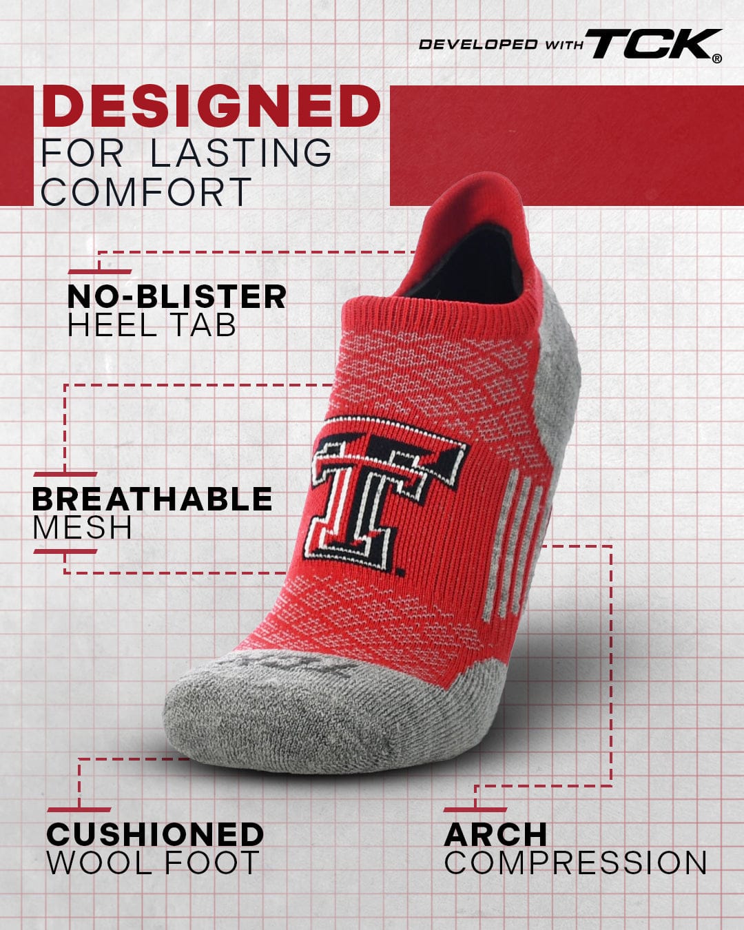 - LOW PROFILE DESIGN: Designed for athletes, sneakerheads, and fans alike, these no show socks with heel tab offer a sleek silhouette while protecting your heel and Achilles. The ultimate Texas Tech Red Raiders running socks or casual sports socks for game day or everyday.