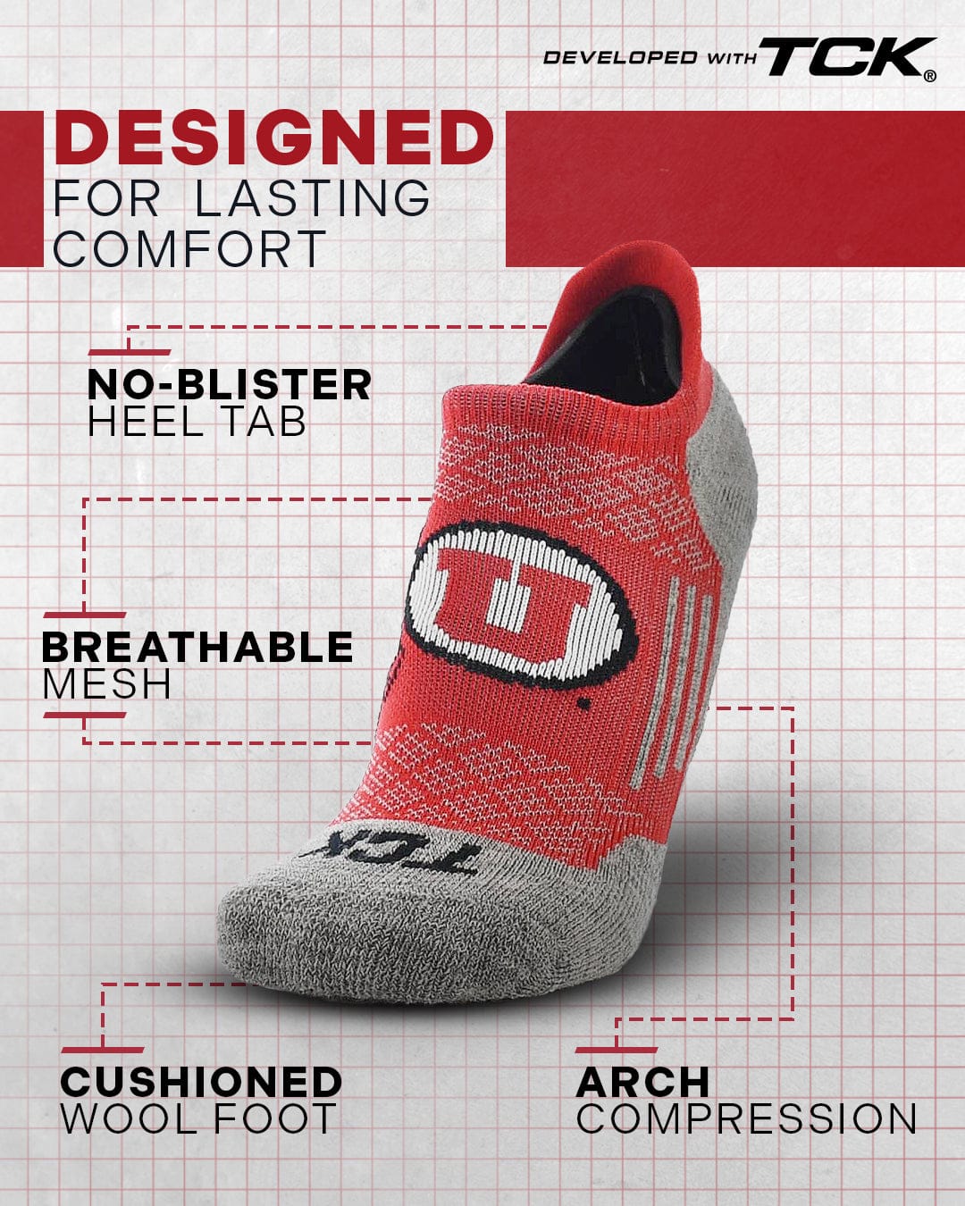 Step up your sock game with TCK's Utah Utes no show socks, high performance NCAA sock made in the USA. Designed for sneakerheads, golfers, runners, and fans alike, these socks feature a soft merino wool footbed, breathable mesh upper, arch support, and a smooth toe seam. The heel tab protects without showing. Perfect for all-day comfort, year-round wear, and gifting for birthdays, Father's Day, grads, or Christmas.