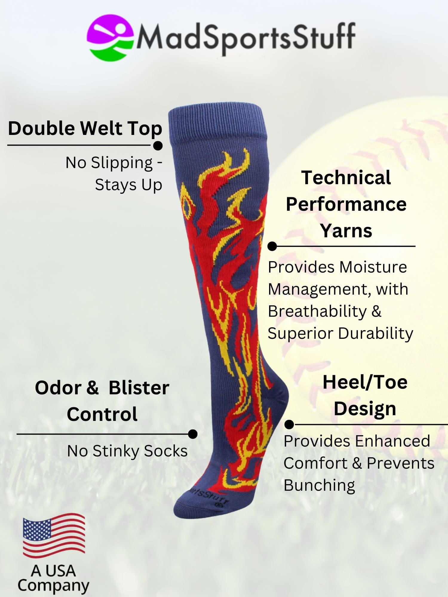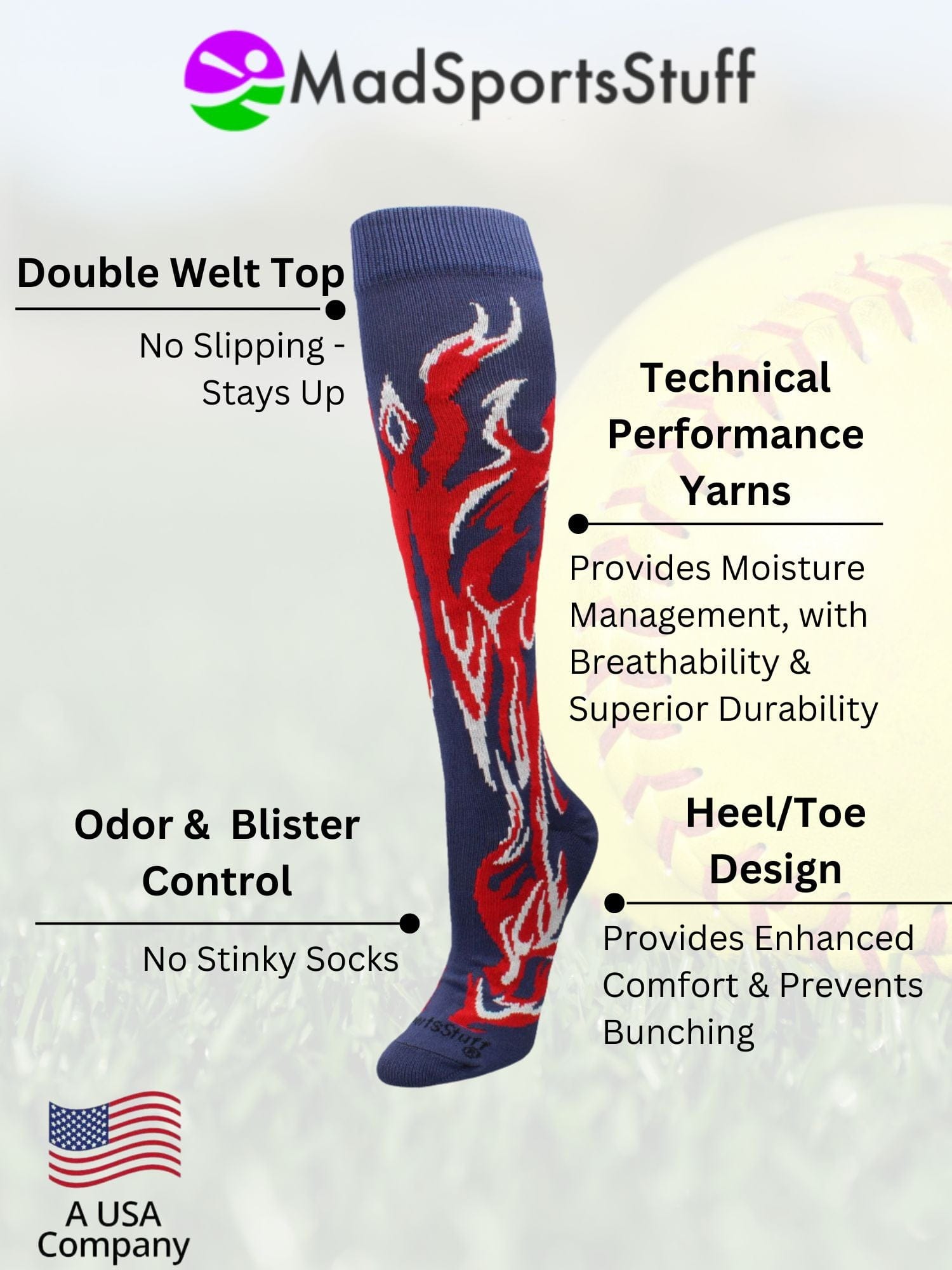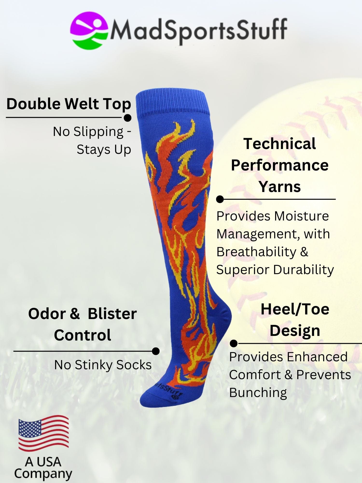 - Fiery Design for Youth Sports: Over-the-calf flame socks with bold, vibrant flames—perfect for kids who want to stand out on the field or court.