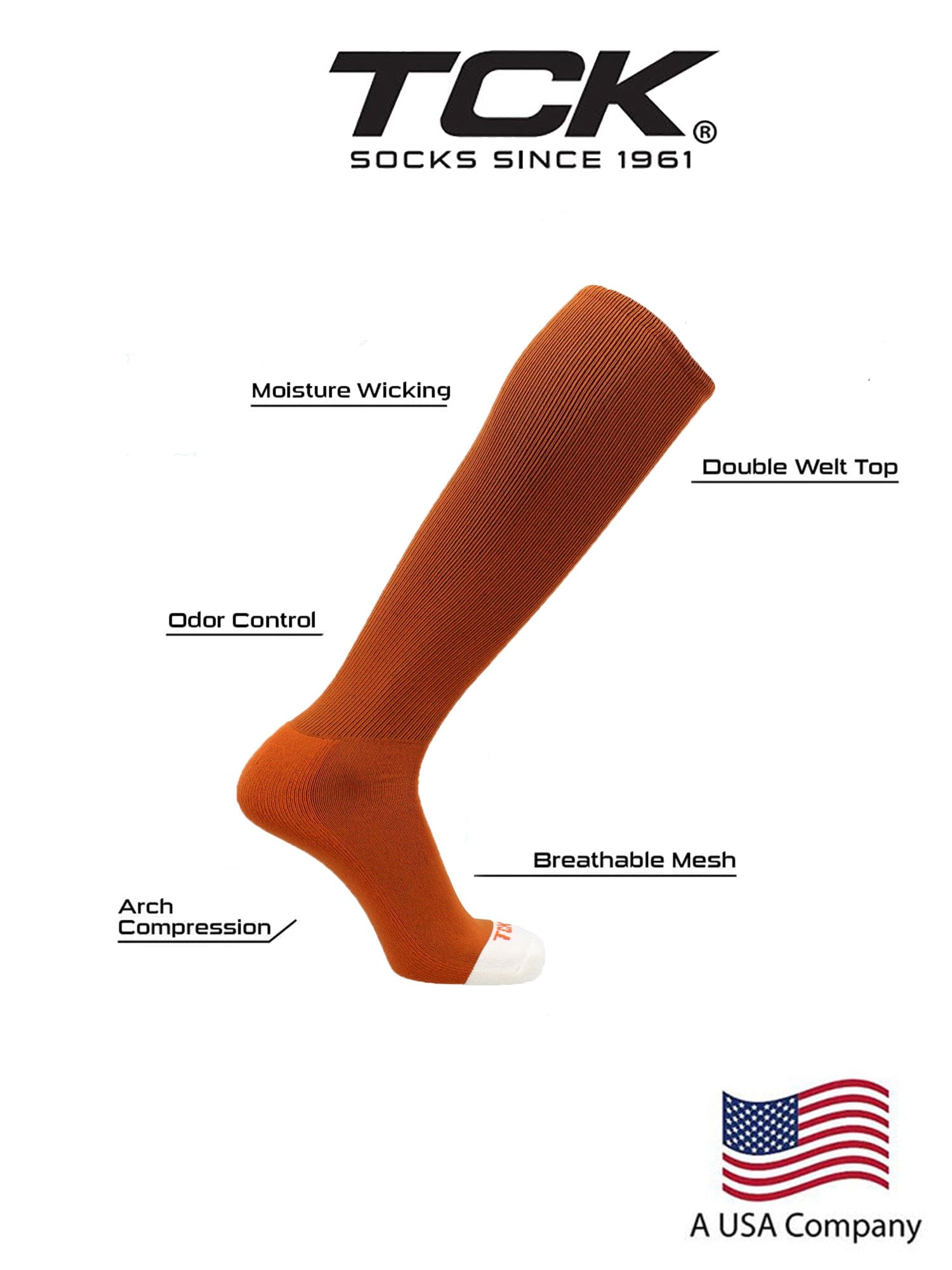 Our TCK Prosport OTC socks are a must have for your next game, outing, or practice. Designed by the leaders in team athletic socks, the Prosport is the ideal weight and length for athletes, while it also provides maximum performance and durability. TCK was founded in 1961 in North Carolina, where we still operate today. When purchasing TCK products, you can feel proud to support a USA based company that directly supports American employees.