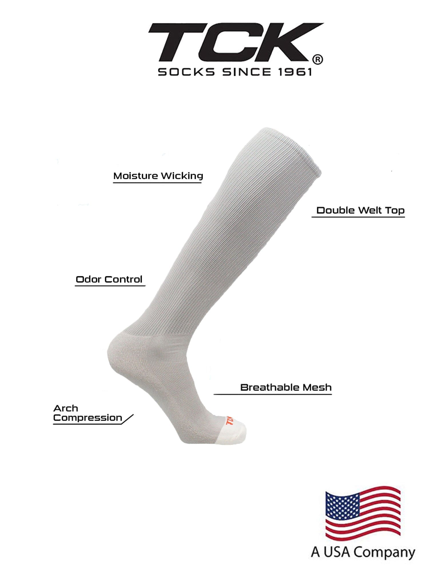 • DESIGNED FOR PERFORMANCE: Our over the calf athletic socks feature our patented TCK DRY moisture control technology which wicks moisture away to keep your feet dry and prevent blisters. There is also a breathable mesh at the top of the foot which helps air flow through the sock. Additionally, our socks are infused with advanced yarns to help control odor.