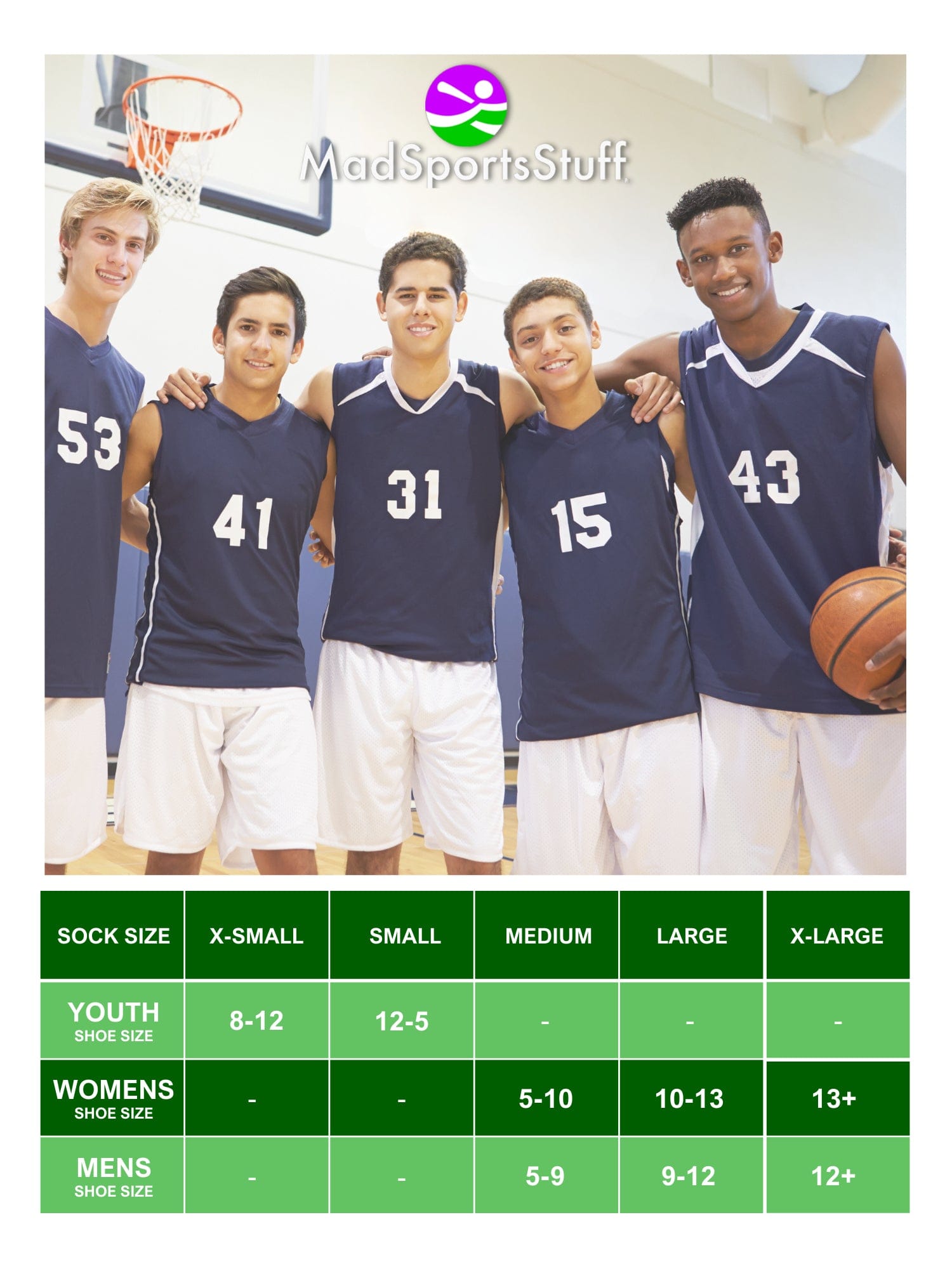 - While other athletic crew socks advertise one size fits most – often you instead receive basketball team socks that are too long, too small or too tight around the calves. Madsportsstuff sports socks come in standard sizes that are accurate to fit, small (youth shoe size 12-5); med (women shoe size 5-10); large (men shoe size 9-12); & extra large (women shoe size 13+; men shoe size 12+). Whether for outdoor basketball fun or any other activity, you get a great fitting sock every time.