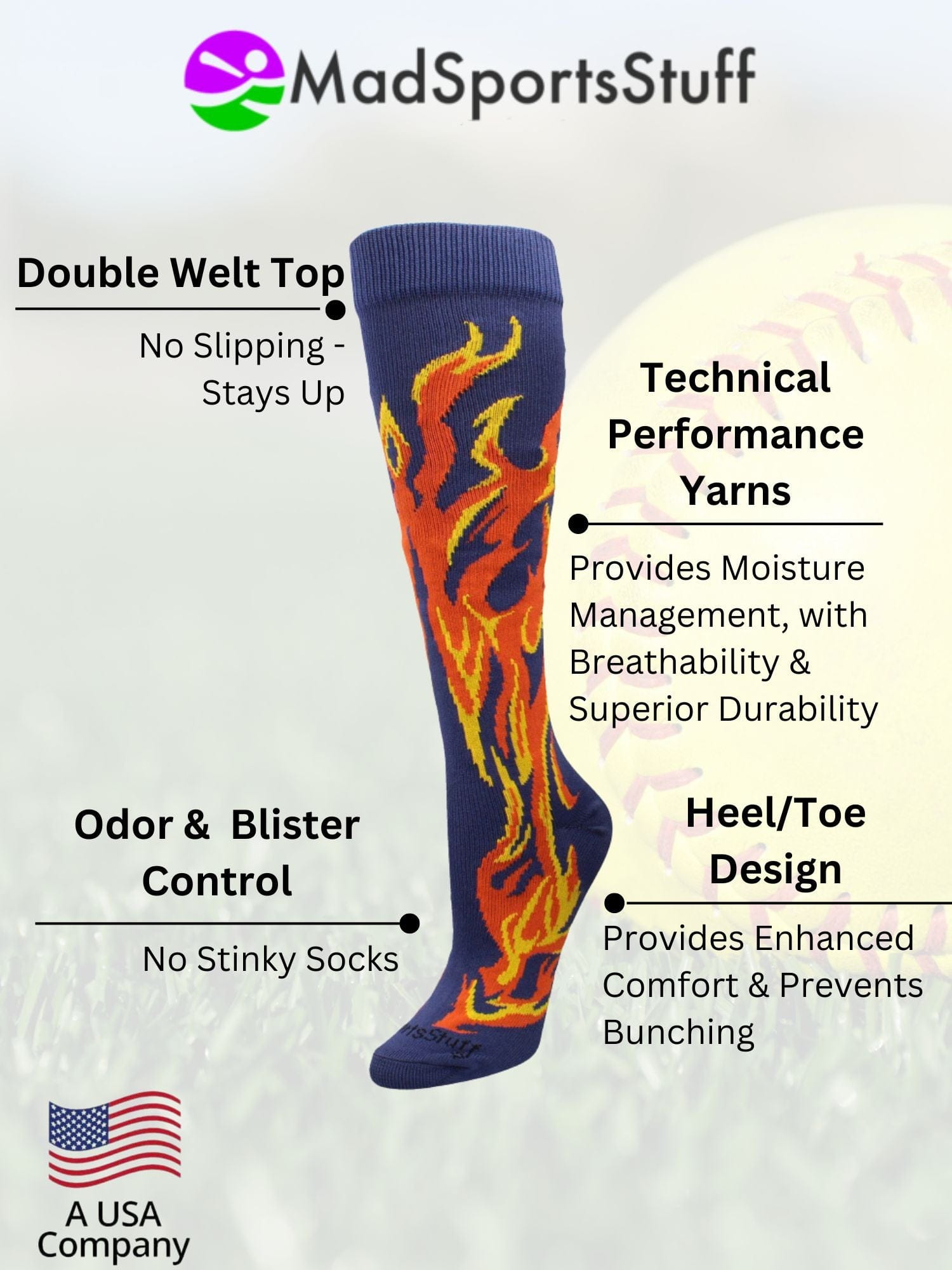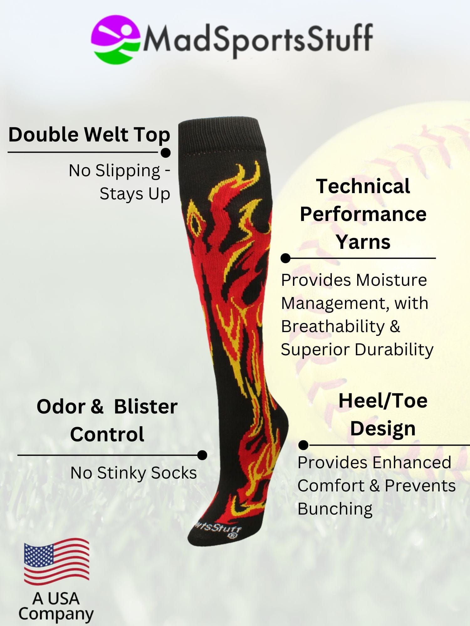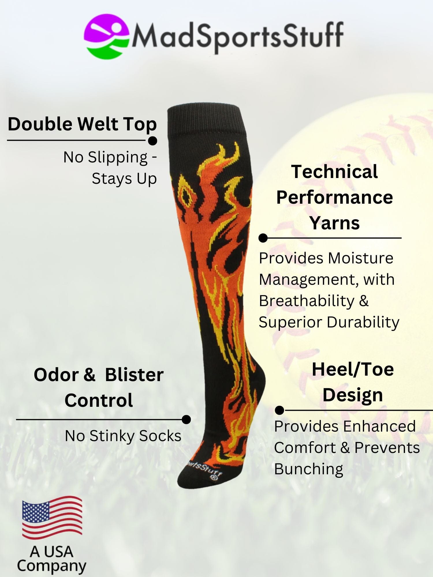 - Fiery Design for Youth Sports: Over-the-calf flame socks with bold, vibrant flames—perfect for kids who want to stand out on the field or court.