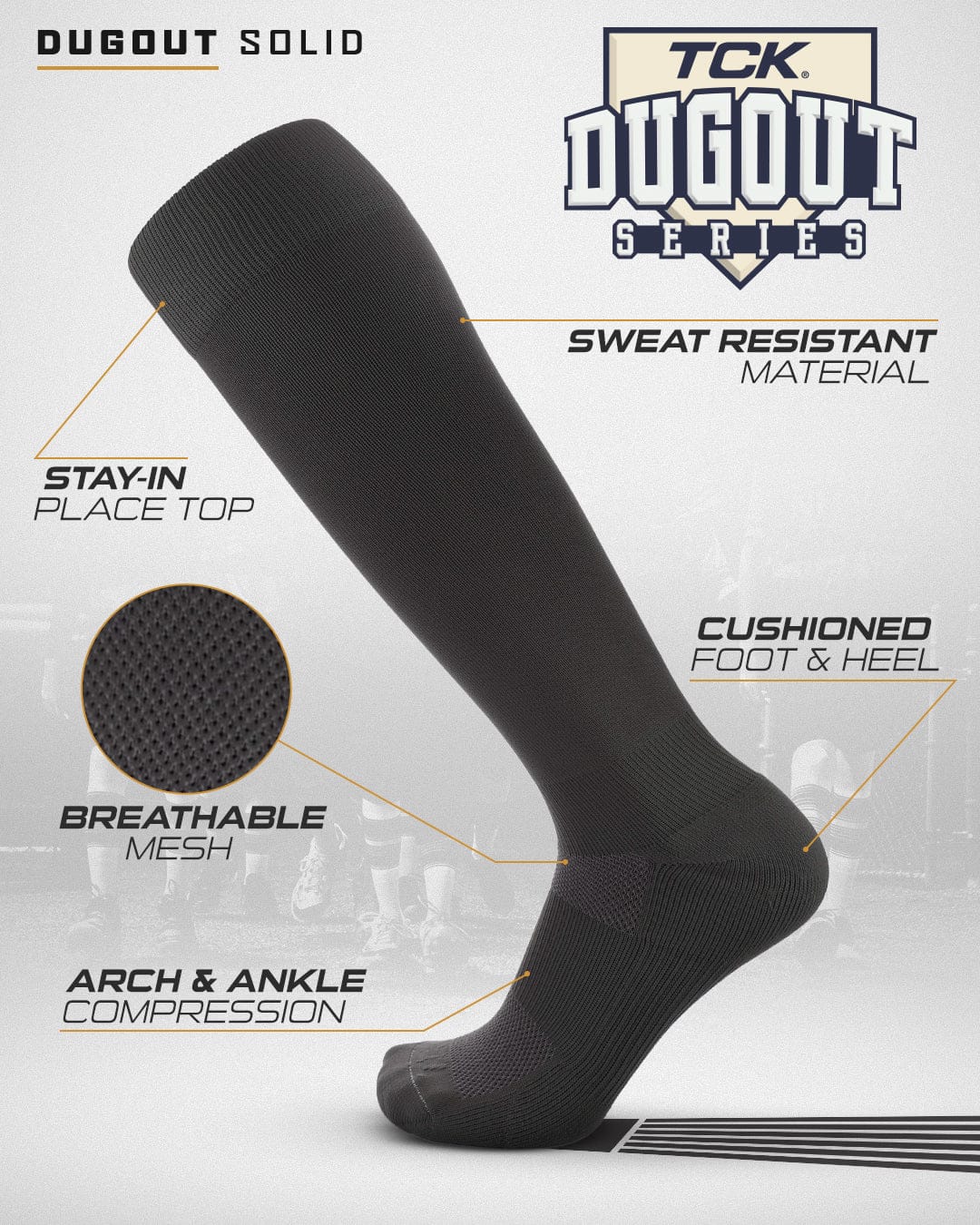 TCK Sports Dugout Series Baseball Softball Socks is a performance knee high baseball sock in solid colors. High performance, moisture wicking, blister control, arch and ankle compression, double welt top to keep sock secure, smooth toe seam, season long durability, ergonomic cushioning, athletic over the calf socks for all baseball, softball, fastpitch, team sports and elite athletes. Made in USA.