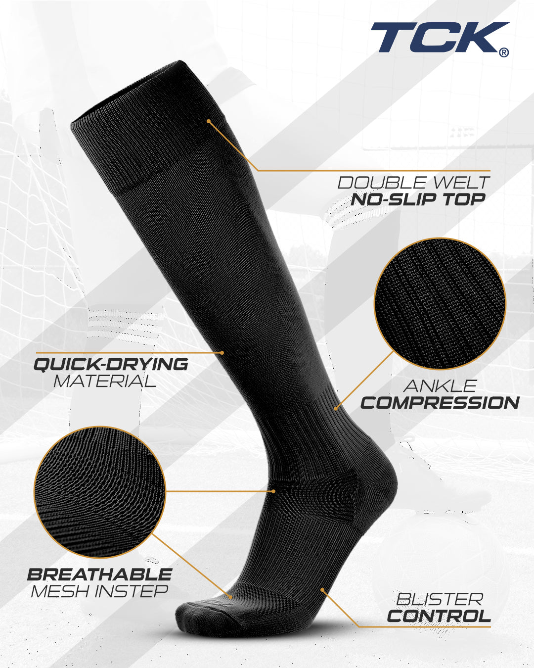 • MOISTURE WICKING boys soccer socks and girls soccer socks feature TCK's patented Dry moisture control yarns to keep feet dry, cool, and blister free during intense match play. Breathable mesh zones improve airflow, and odor resistant fibers help maintain freshness. Ideal for players at all levels, including soccer socks youth boys 8-12, who need comfort and performance that lasts all game.