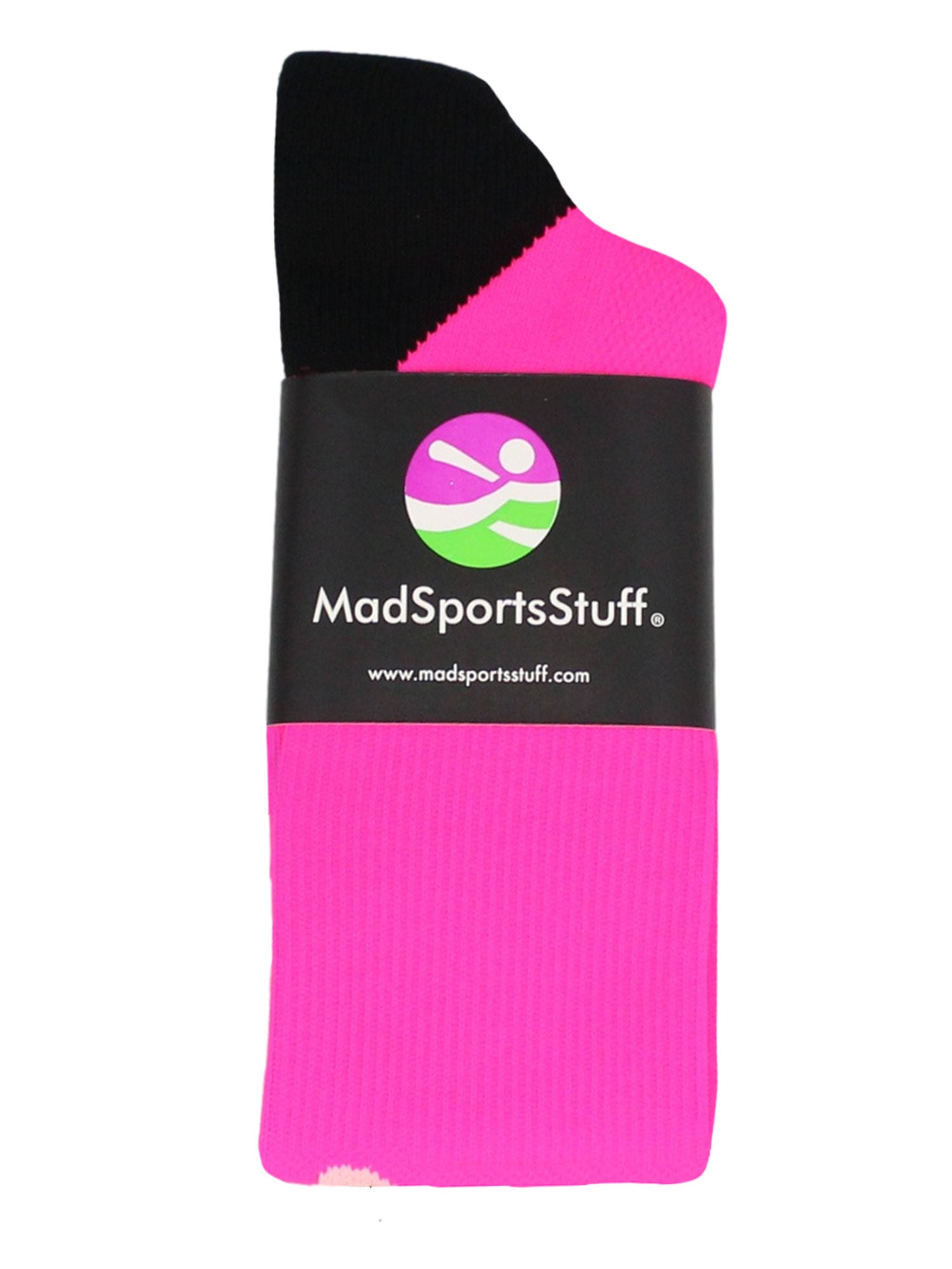MadSportsStuff Pink Ribbon Breast Cancer Awareness Socks with Stripes. High performance athletic socks for all team sports and elite athletes. This sock is an over the calf length which hits just below the knee. Ideal for football, baseball, softball, soccer, field hockey, basketball, lacrosse, volleyball, wrestling and more!