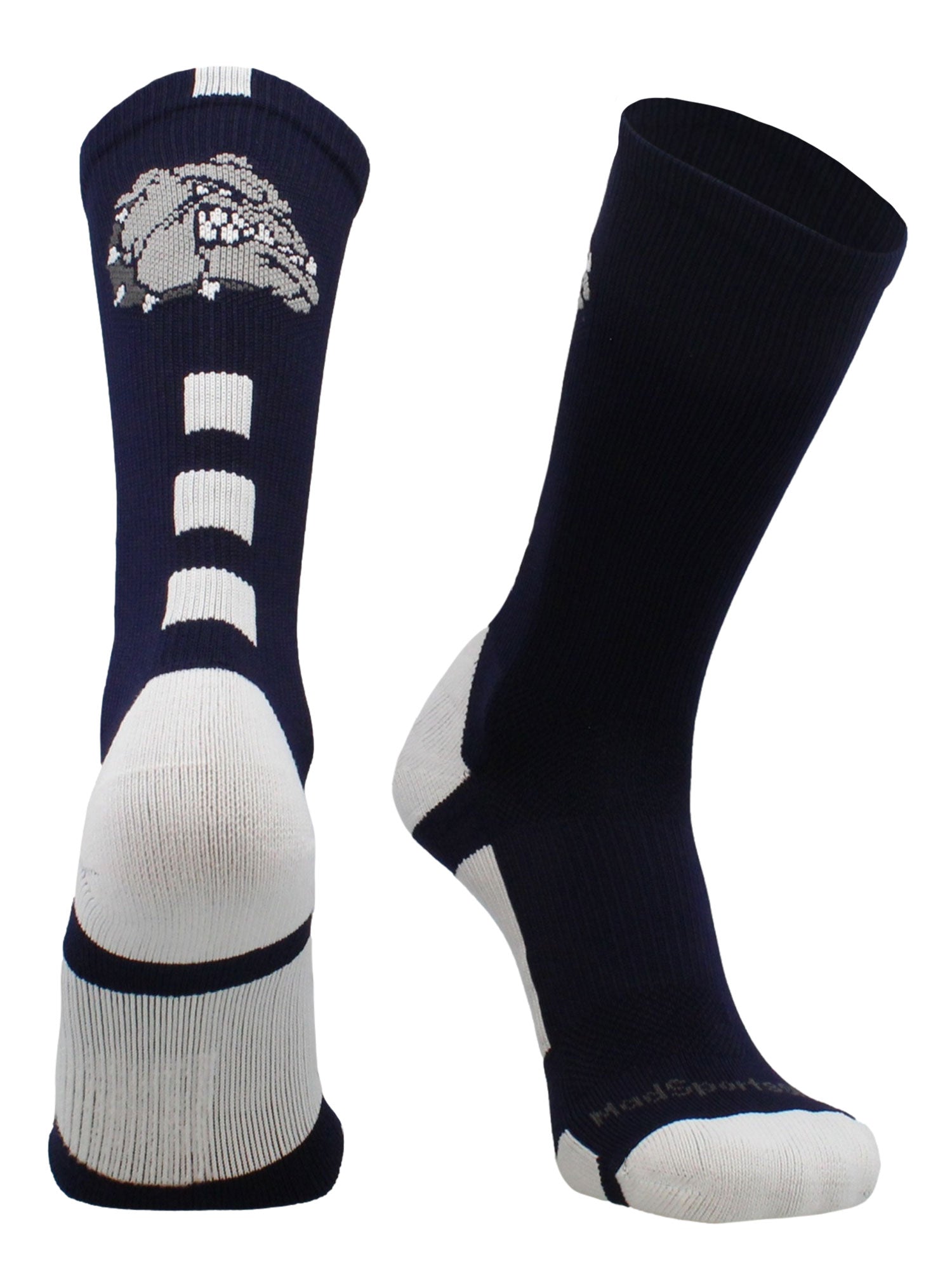 MadSportsStuff Bulldogs Logo Athletic Crew Socks. High performance athletic socks for all team sports and elite athletes. Our Bulldog socks are ideal for softball, baseball, lacrosse, basketball, field hockey, volleyball, wrestling, soccer, football, cheer, kickball and more!